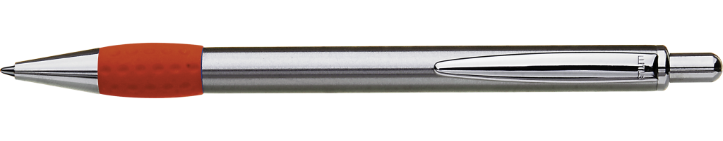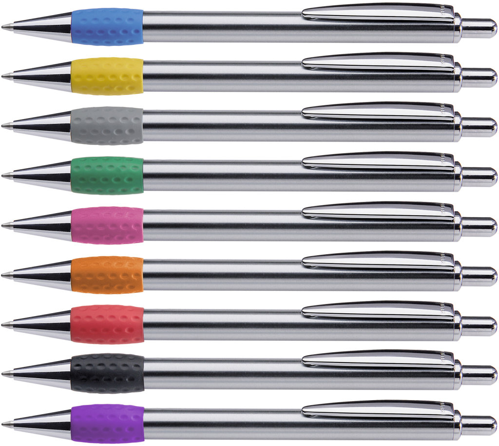 Metall-Druckkugelschreiber mit Schaft, Drücker, Clip und Spitze glanzverchromt. Gummigriffzone farbig.Druckbereich: In Clipverlängerung 30mm x 20mm Siebdruck (MS), in Clipverlängerung 30mm x 6mm Lasergravur (L), gegenüber vom Clip 70mm x 13mm Siebdruck (MS), gegenüber vom Clip 70mm x 6mm Lasergravur (L), seitlich vom Clip 70mm x 13mm Siebdruck (MS), seitlich vom Clip 70mm x 6mm Lasergravur (L), auf dem Clip 20mm x 3mm Lasergravur (L), in Clipverlängerung 30mm x 6mm Einzelnamensgravur (EL), gegenüber vom Clip 70mm x 6mm Einzelnamensgravur (EL), seitlich vom Clip 70mm x 6mm Einzelnamensgravur (EL), auf dem Clip 20mm x 3mm Einzelnamensgravur (EL)