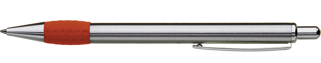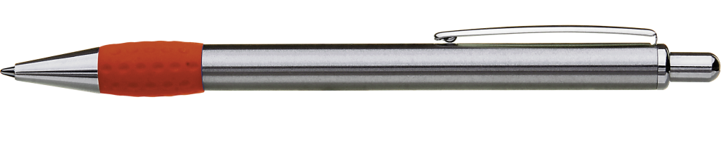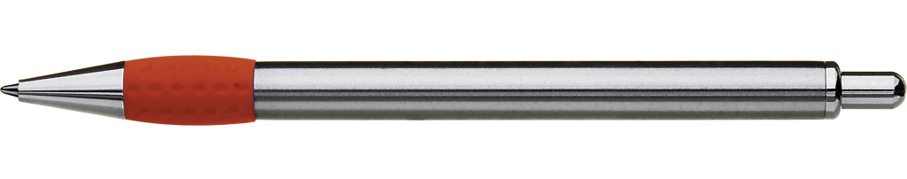 Metall-Druckkugelschreiber mit Schaft, Drücker, Clip und Spitze glanzverchromt. Gummigriffzone farbig.