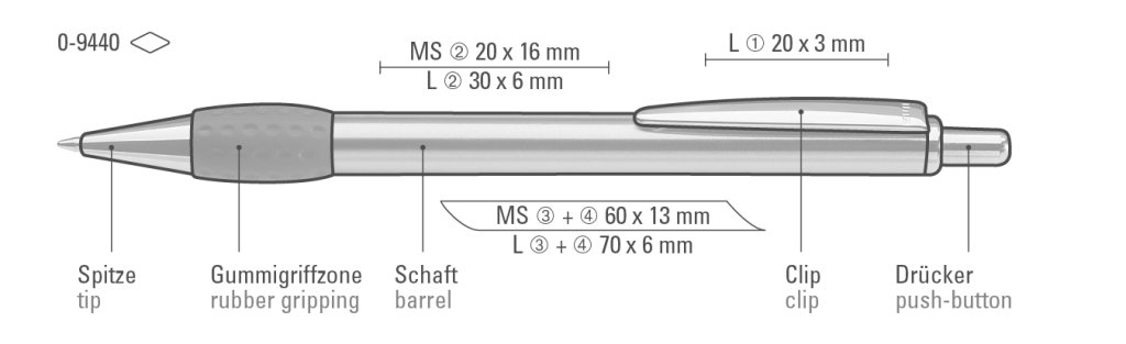 Druckbereich: In Clipverlängerung 30mm x 20mm Siebdruck (MS), in Clipverlängerung 30mm x 6mm Lasergravur (L), gegenüber vom Clip 70mm x 13mm Siebdruck (MS), gegenüber vom Clip 70mm x 6mm Lasergravur (L), seitlich vom Clip 70mm x 13mm Siebdruck (MS), seitlich vom Clip 70mm x 6mm Lasergravur (L), auf dem Clip 20mm x 3mm Lasergravur (L), in Clipverlängerung 30mm x 6mm Einzelnamensgravur (EL), gegenüber vom Clip 70mm x 6mm Einzelnamensgravur (EL), seitlich vom Clip 70mm x 6mm Einzelnamensgravur (EL), auf dem Clip 20mm x 3mm Einzelnamensgravur (EL)