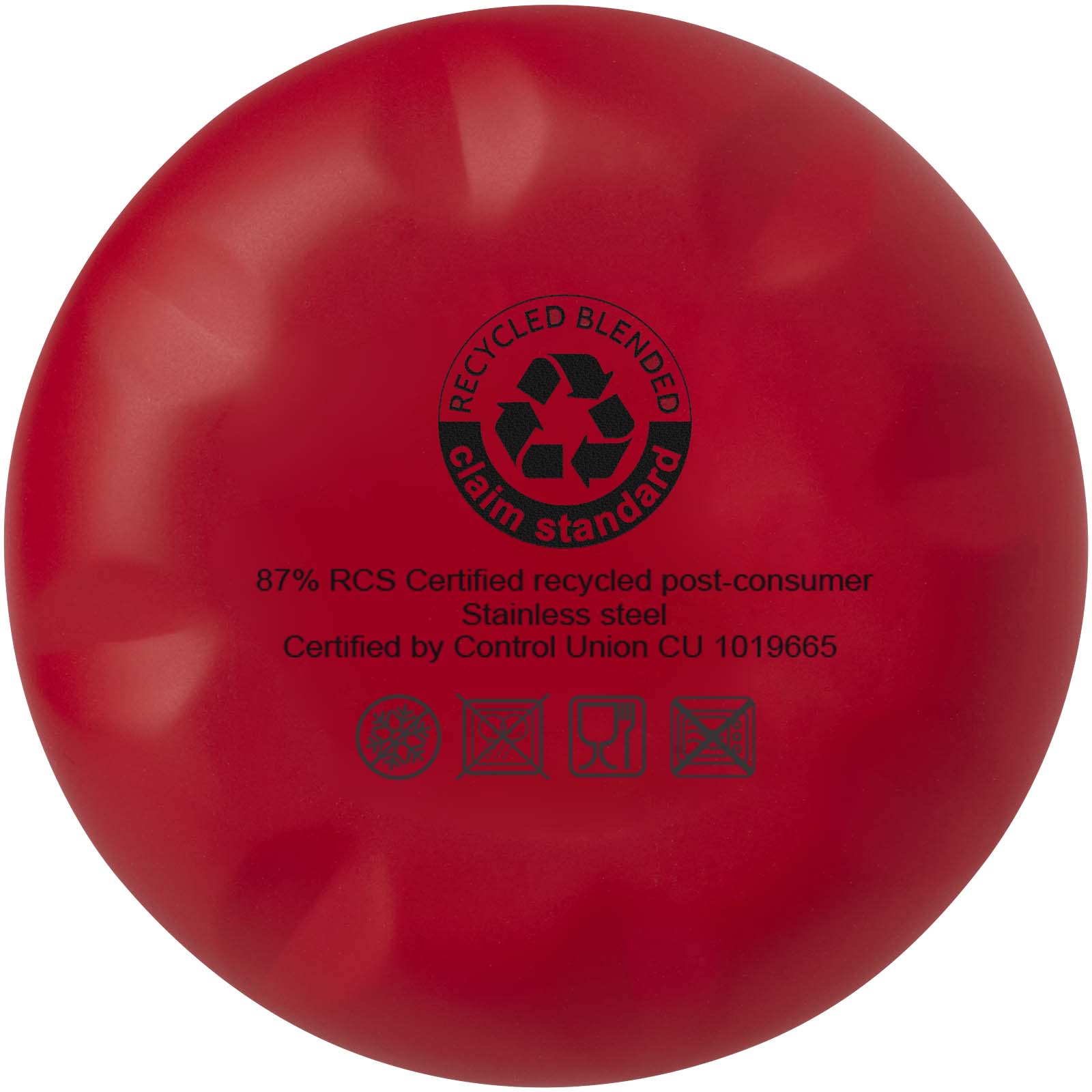 Vakuumisolierte, RCS-zertifizierte Flasche aus recyceltem Edelstahl mit kultigem Design, die Getränke mehrere Stunden lang heiß oder kalt hält. Mit einem Sockel, der in die meisten Getränkehalter passt, ist diese elegante Wasserflasche ein perfekter Werbeartikel. Geprüft und zugelassen nach deutschem Lebensmittelsicherheitsgesetz (LFGB) und gemäß REACH Verordnung auf Phtalate getestet. Das Fassungsvermögen beträgt 500 ml. Verpackt in einer Geschenkbox aus Recyclingkarton.