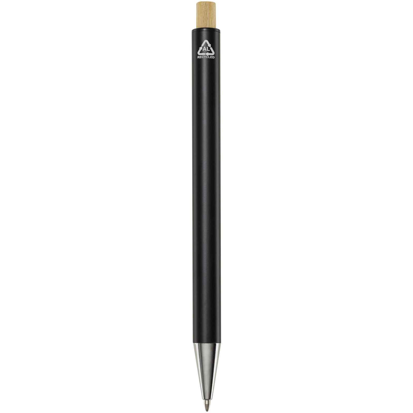 Der Cyrus Kugelschreiber ist aus recyceltem Aluminium hergestellt, was weniger Energie benötigt als die Herstellung von Aluminium aus Rohstoffen. Es reduziert außerdem die Abfallmenge auf Mülldeponien und trägt dazu bei, natürliche Ressourcen zu schonen und Treibhausgasemissionen zu reduzieren. Druckknopf ist aus Bambus gefertigt. Tintenfarbe: Blau. Schreiblänge: 800 Meter. Spitzengröße: 1,00 mm.