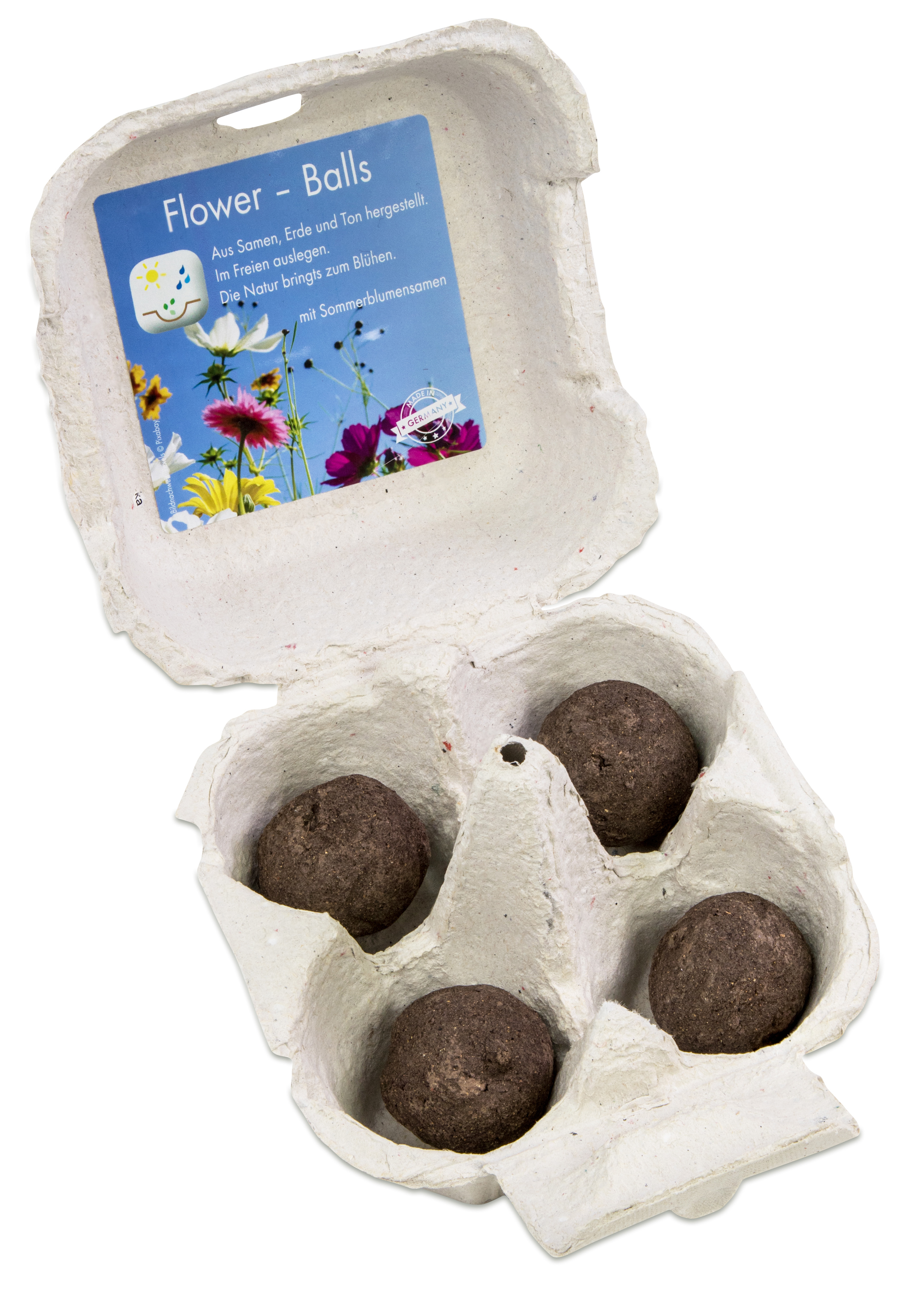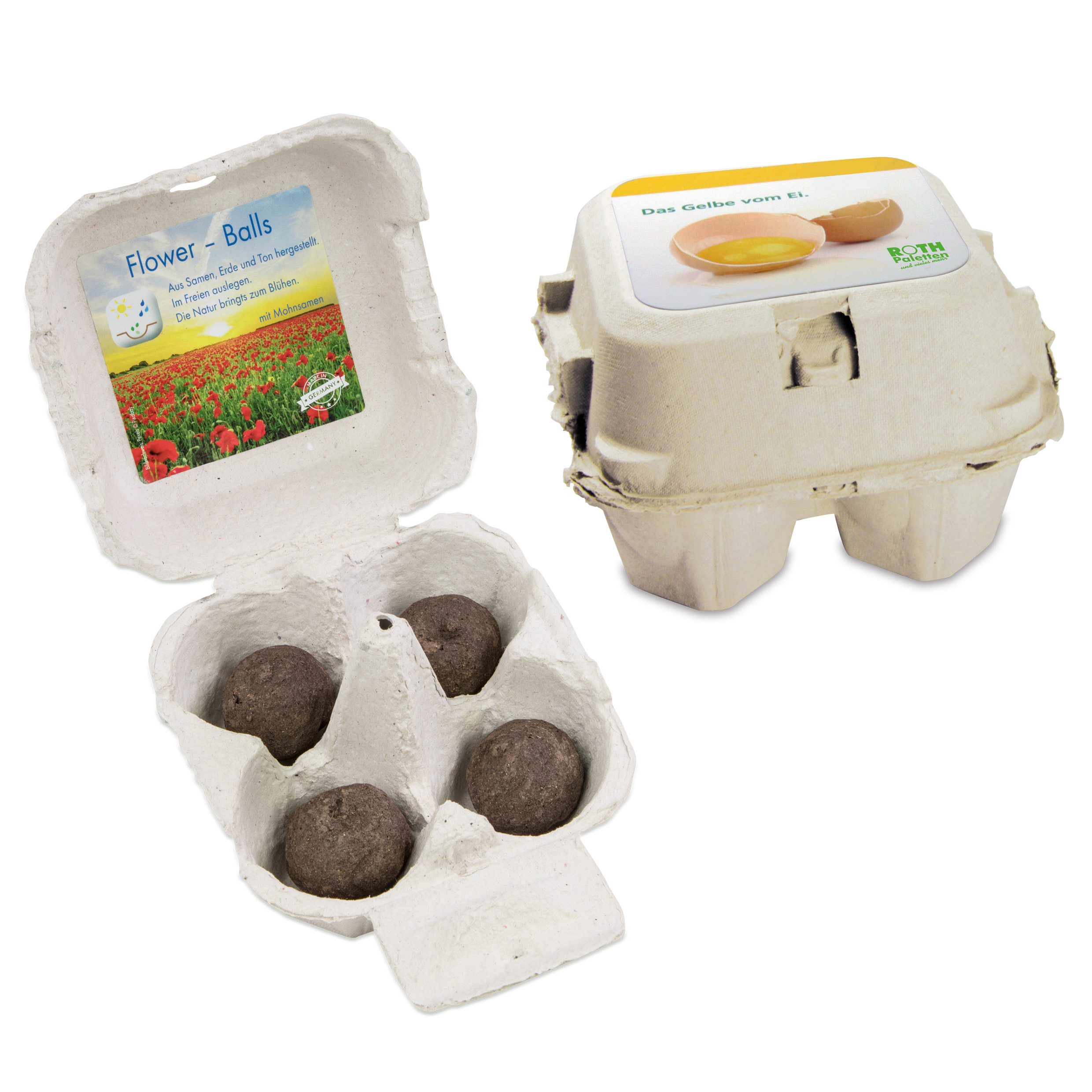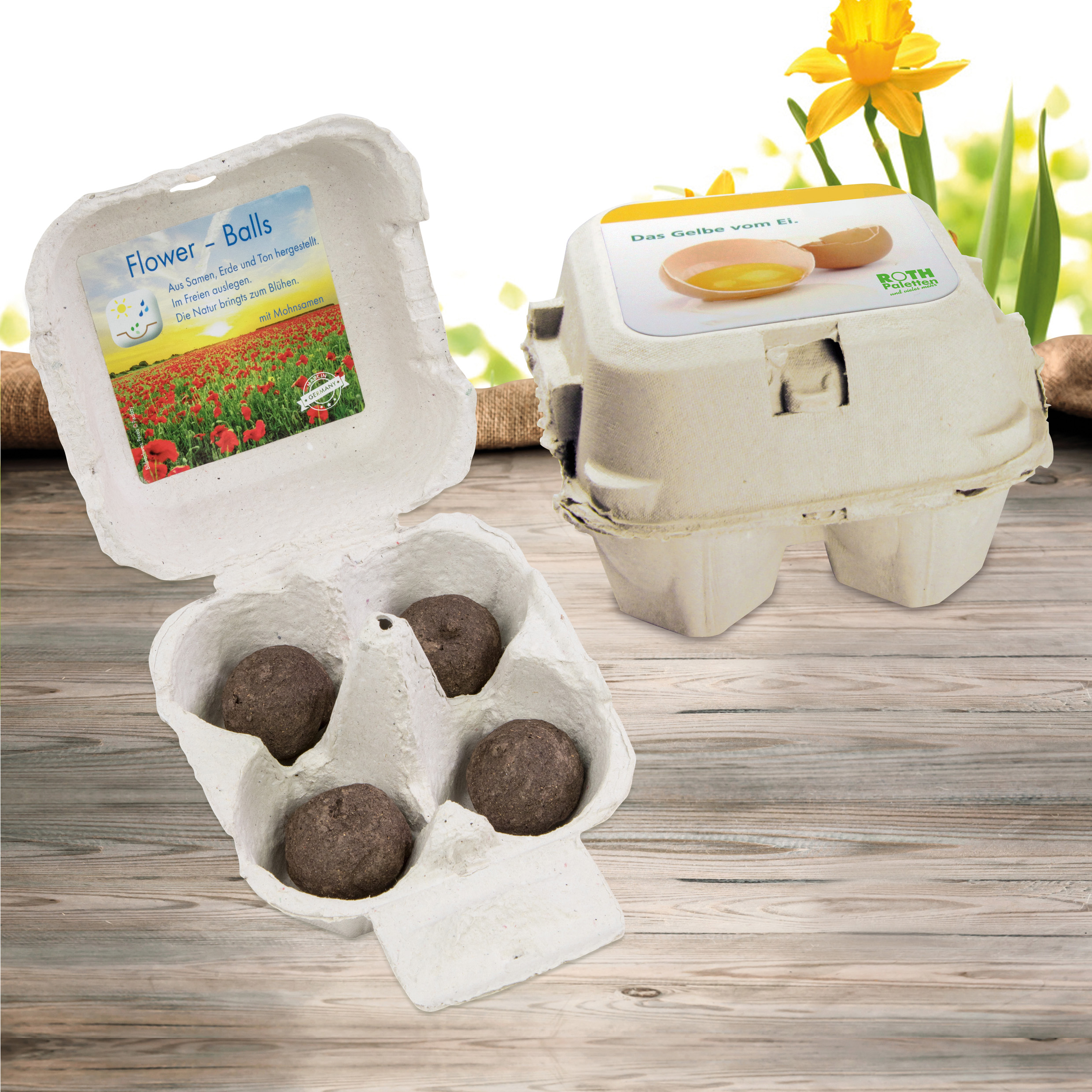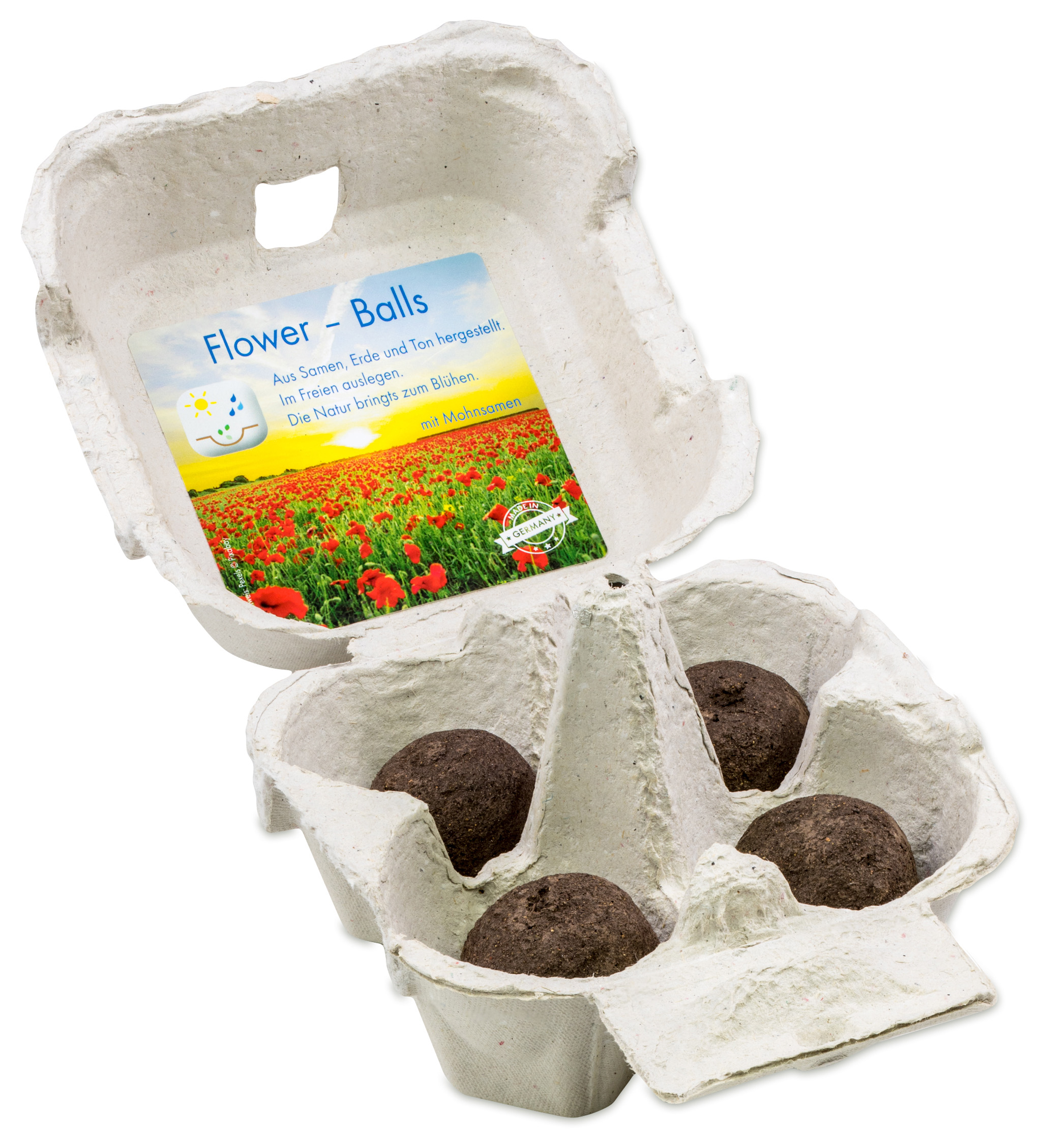 Mal nicht aus Schokolade sind die Ostereier im Eierkarton. Bei diesem grünen Werbeartikel erwarten den Kunden vier Flower-Balls, kleine Kugeln, bestehend aus Samen, Erde und Tonpulver. Diese werden beliebig und ohne Einpflanzen direkt auf dem Boden verteilt. Die Natur bringt sie dann zum Blühen. Zur Auswahl stehen die Flower-Balls entweder mit Mohn- oder mit Sommerblumensamen, über deren Blüten sich die Bienen, Schmetterlinge und andere Insekten freuen werden. Außen auf dem Original Eierkarton wird ein Werbeaufkleber mit viel Platz für die individuelle Werbebotschaft angebracht.