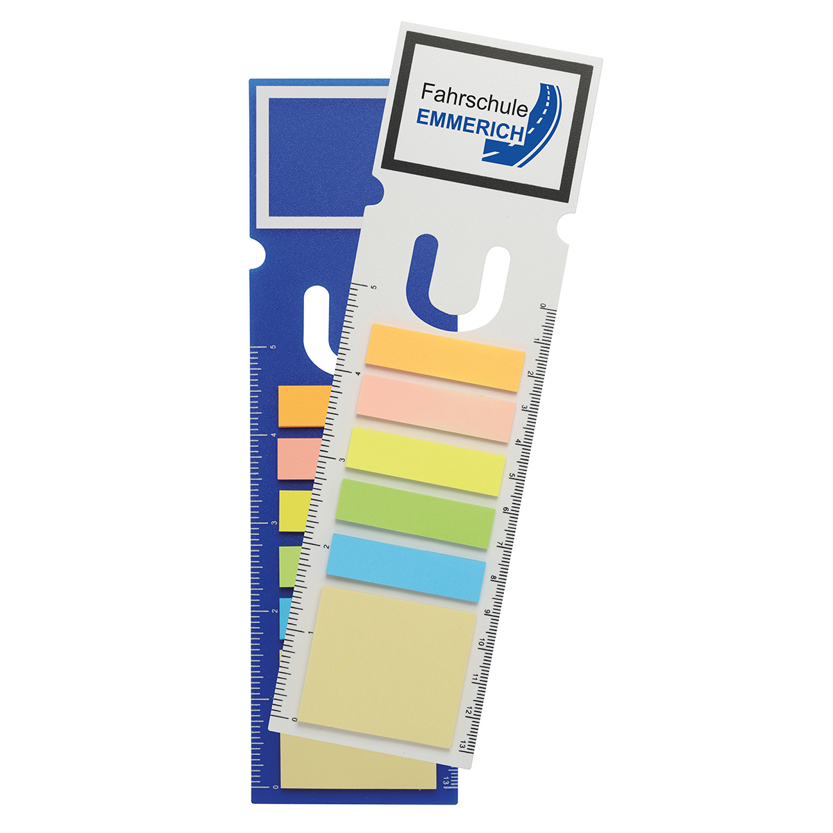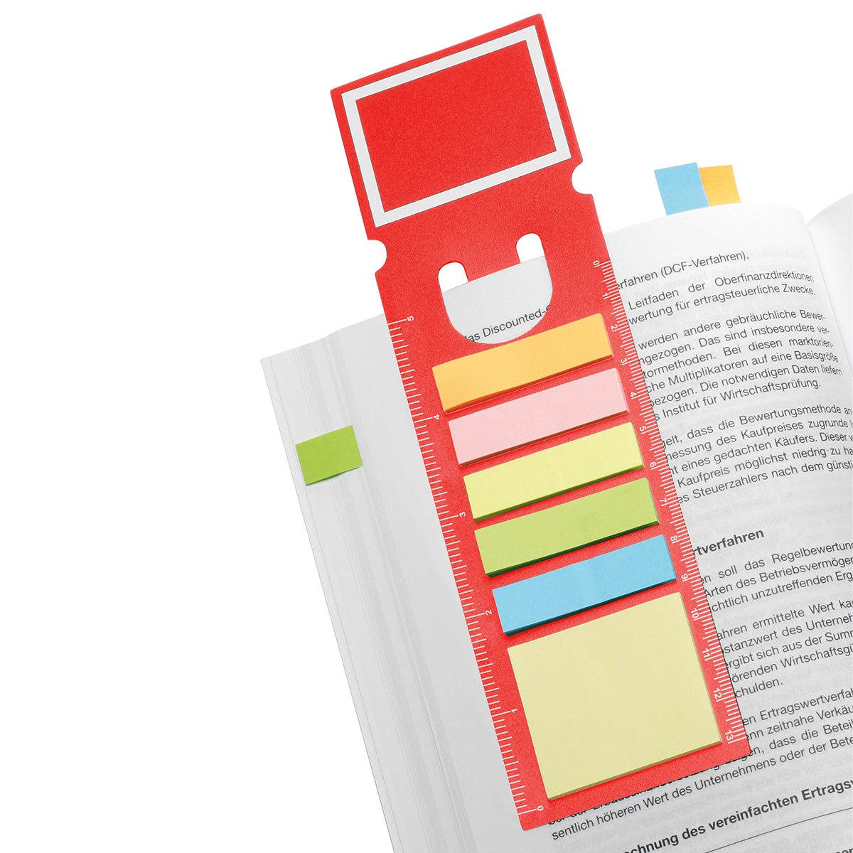 Mit jeweils ca. 25 Haftnotizmarkern in 6 verschiedenen Farben (ca. 12 x 45 mm und ca. 40 x 45 mm) und gedruckten Skalen (13 cm und 5 Inch)