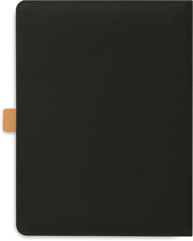 DIN A5 Mappe aus RPET mit Details aus Kunstleder. Auswechselbares A5-Notizbuch mit gebundenem Hard Cover. 64 Blatt (128 Seiten) liniertes Recyclingpapier. Stifthalter, 2 Kartenfächer und ein großes Fach. Elastisches Verschlussband mit Dekor aus Metall.