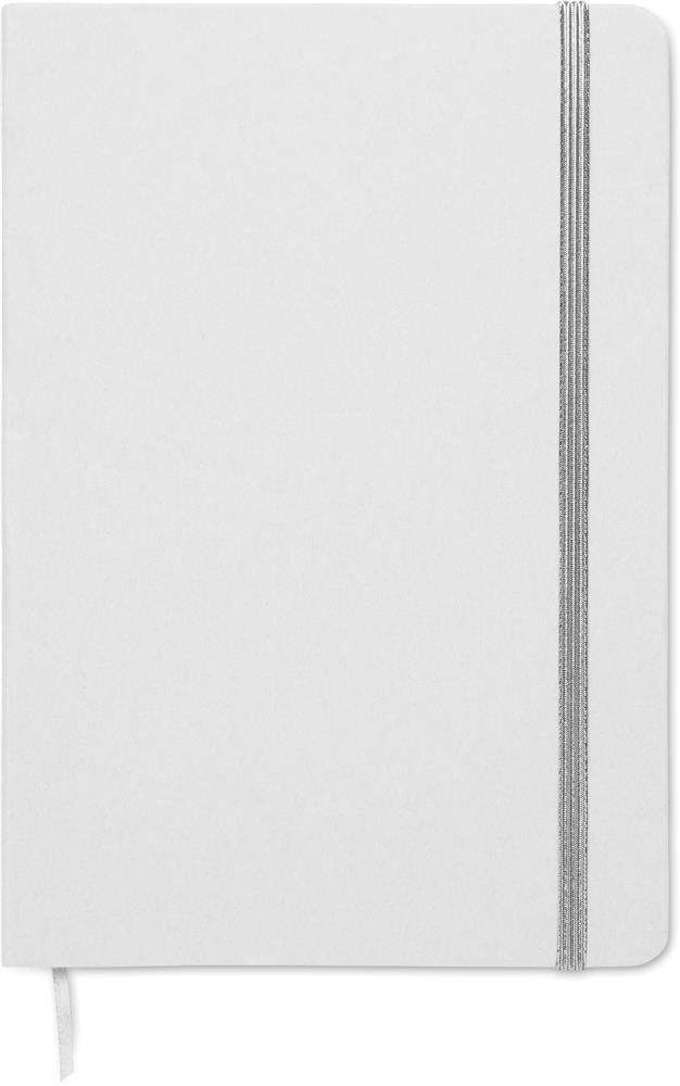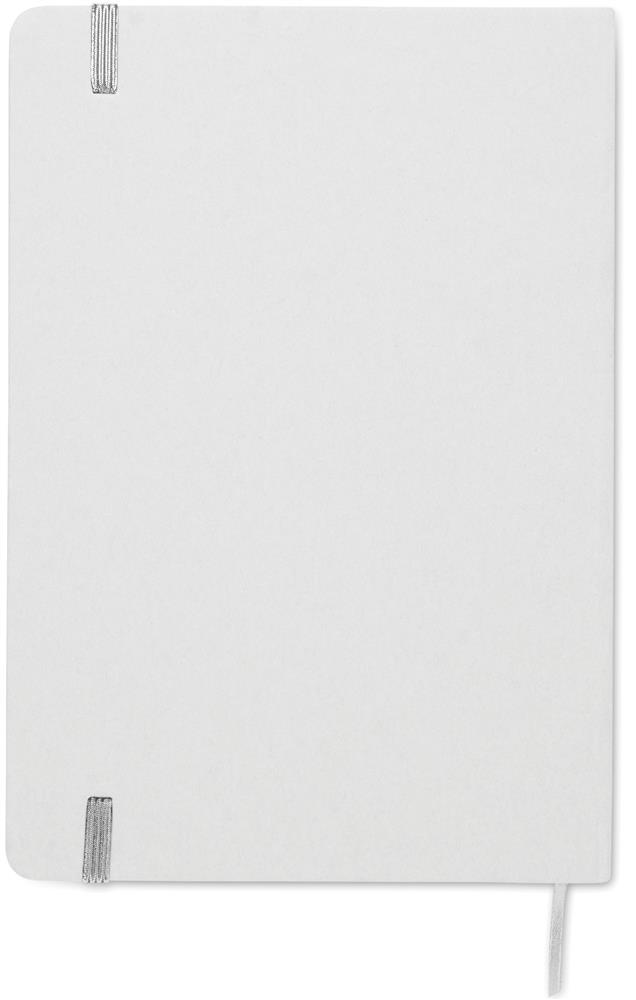 DIN A5 Notizbuch mit gebundenem Hard Cover aus 70% recyceltem Milchkarton und 30% recyceltem Papier. Weißes Cover. 80 Blatt (160 Seiten) liniertes Recyclingpapier. Nach der Gravur des Covers, wird die Farbe sichtbar. Farblich abgestimmtes elastisches Verschlussband und Lesebändchen.