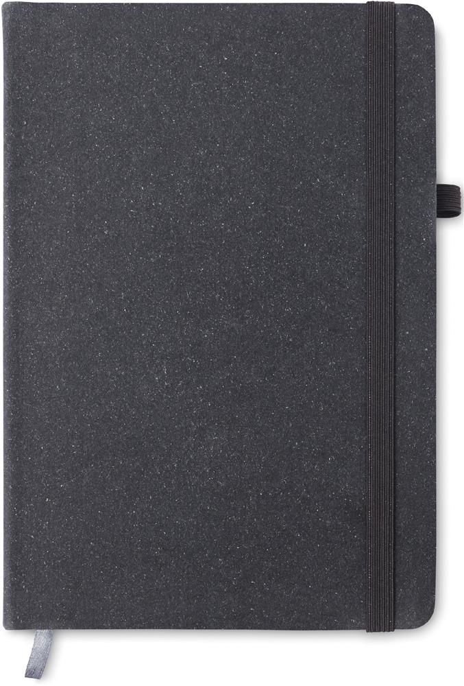 DIN A5 Notizbuch mit Hardcover aus 70% recyceltem Pre-Consumer-Leder und 30% PU-Latex. 80 Blatt (160 Seiten) liniertes Recyclingpapier. Mit farblich passendem elastischen Verschlussband und Stiftschlaufe .