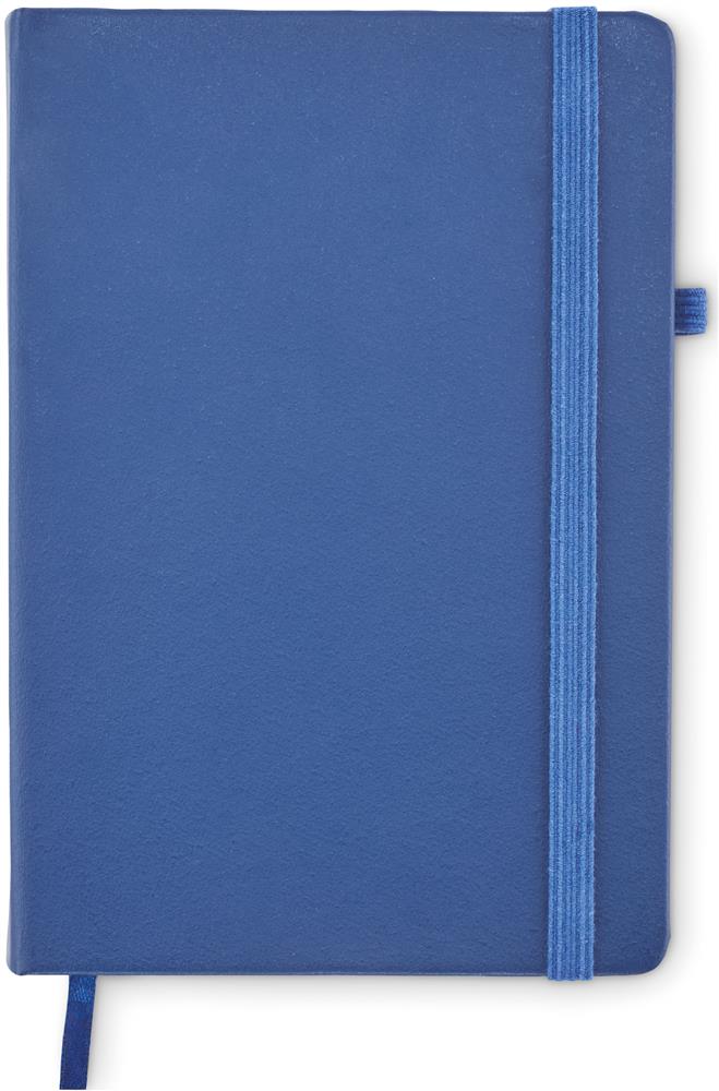 DIN A5 Notizbuch mit Hardcover aus 70% recyceltem Pre-Consumer-Leder und 30% PU-Latex. 96 Blatt (192 Seiten) liniertes Recyclingpapier. Mit farblich passendem elastischen Baumwoll Verschlussband und Stiftschlaufe.
