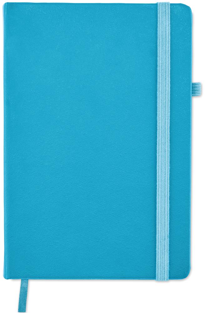 DIN A5 Notizbuch mit Hardcover aus 70% recyceltem Pre-Consumer-Leder und 30% PU-Latex. 96 Blatt (192 Seiten) liniertes Recyclingpapier. Mit farblich passendem elastischen Baumwoll Verschlussband und Stiftschlaufe.