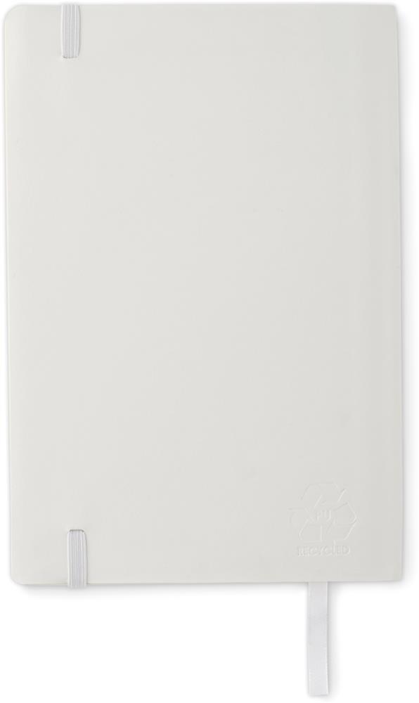 DIN A5 Notizbuch mit gebundenem Soft Cover aus recyceltem PU (81% recyceltes Polyester, 19% PU). 80 Blatt (160 Seiten) recyceltes, liniertes Papier. Rückseitige Innentasche. Elastisches Verschlussband, Lesebändchen.