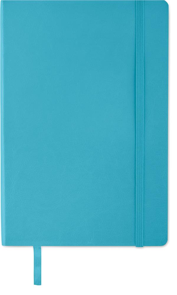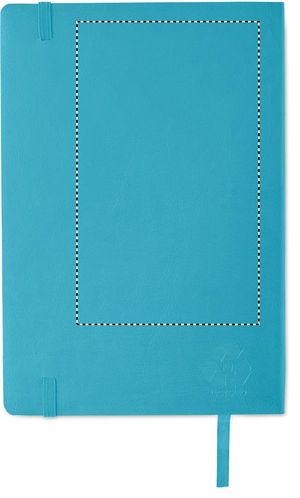 DIN A5 Notizbuch mit gebundenem Soft Cover aus recyceltem PU (81% recyceltes Polyester, 19% PU). 80 Blatt (160 Seiten) recyceltes, liniertes Papier. Rückseitige Innentasche. Elastisches Verschlussband, Lesebändchen.