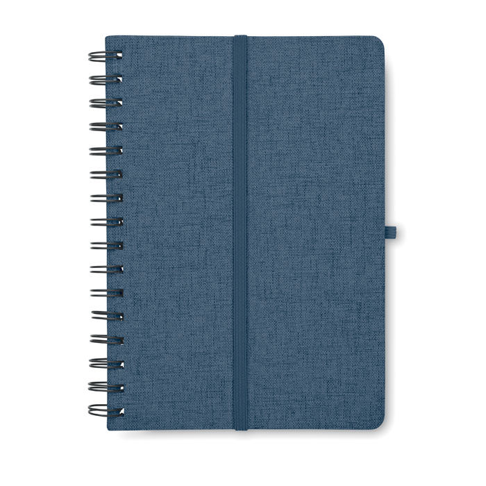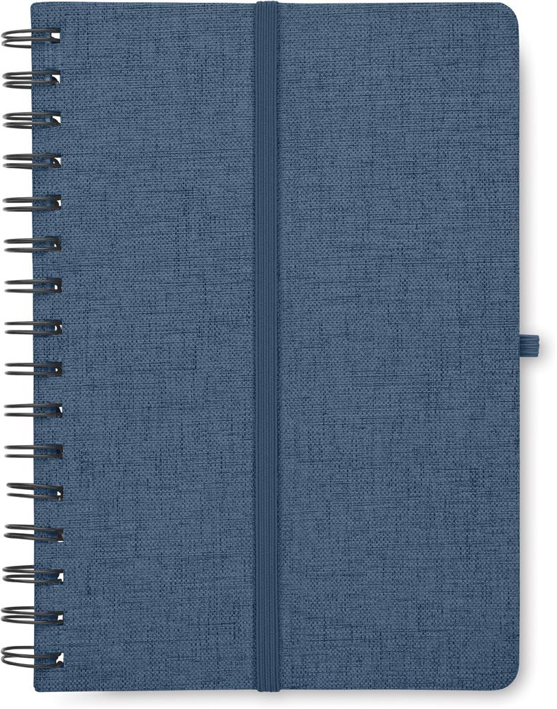 DIN A5 Notizbuch mit Hard Cover aus 600D RPET. Inkl. Smartphone-Halter. Spiralbindung. 80 Blatt (160 Seiten) liniertes Recyclingpapier 70g/m². Elastisches Verschlussband.