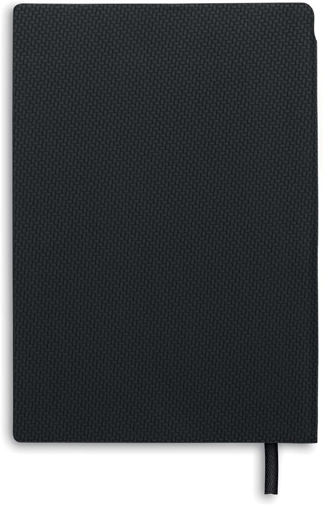 DIN A5 Notizbuch mit gebundenem, strukturiertem Einband aus PU. Drehkugelschreiber aus ABS und Stifthalter im Buchrücken. 80 Blatt (160 Seiten) liniertes Recyclingpapier.