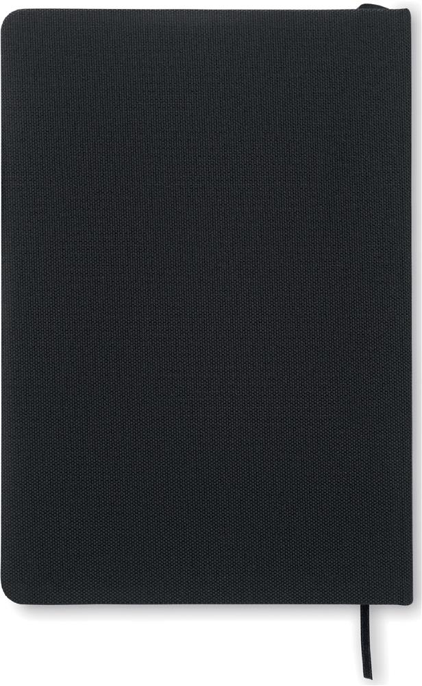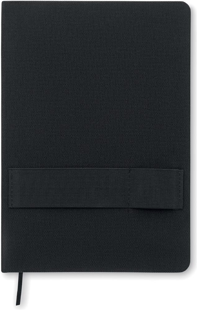 DIN A5 Notizbuch mit gebundenem Hard Cover aus 600D RPET. 80 Blatt (160 Seiten) liniertes Recyclingpapier. Stiftschlaufe, Smartphone-Schlaufe auf Frontseite, Lesebändchen. Druckkugelschreiber aus Aluminium/Bambus. Rückseitige Dokumententasche. Blaue Tinte.