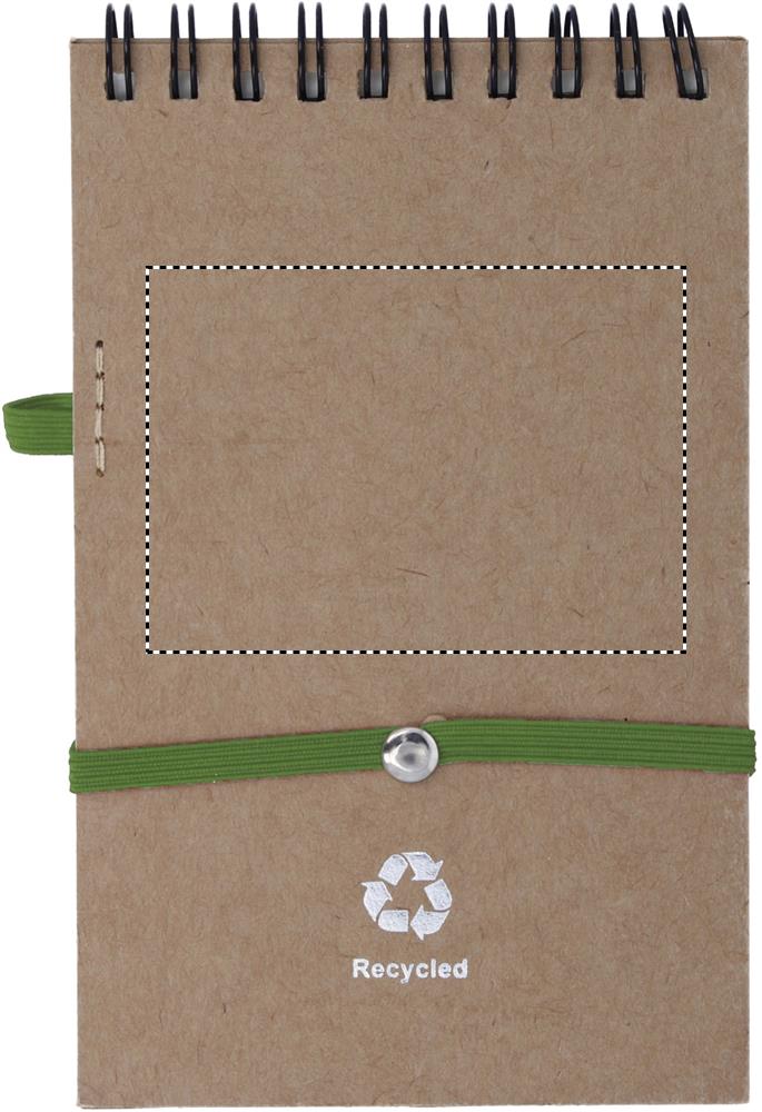 Notizbuch mit 70 Blatt (140 Seiten) recyceltem Blankopapier. Spiralbindung. Stiftschlaufe. Druckkugelschreiber aus recyceltem Karton mit Clip, Spitze und Drücker aus natürlich abbaubarem Kunststoff. Blaue Tinte.Material: Recyceltes PapierMaße: 14x9x0,7 cmGewicht: 0.082 kgVeredelung: Bestickung, Bedruckung, BeflockungHandling/Farbcodes: Z/03, 04, 05, 10, 48Druckposition: FRONT TOPDruckmaße: 70 x 50 mmDrucktechniken: B, DL, DO1, L3, P3Druckposition: FRONT BOTTOMDruckmaße: 70 x 50 mmDrucktechniken: B, DL, DO1, L3, P3Druckposition: BARREL RIGHT HANDEDDruckmaße: 60 x 7 mmDrucktechniken: P3Druckposition: BACKDruckmaße: 70 x 50 mmDrucktechniken: B, DL, P3, L3Druckposition: FIRST PAGEDruckmaße: 70 x 50 mmDrucktechniken: P3