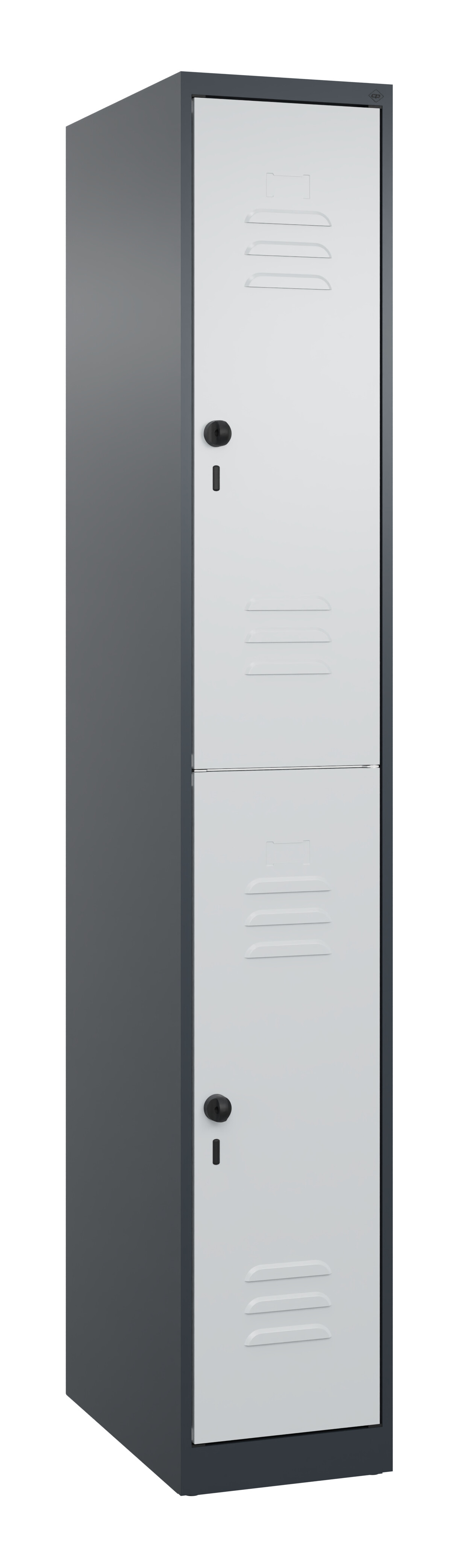 Doppelstöckiger Spind Classic PLUS, 1 Abteil mit 2 Fächern, Abteilbreite 300 mm, Korpus aus stabiler Stahlkonstruktion mit hochwertiger Einbrennbeschichtung für hohe UV- und Korrosionsbeständigkeit, mit hinteren Belüftungsöffnungen oben und unten, innen je Fach 1 stabile Garderobenstange aus Ovalprofil mit 3 verdrehsicheren Doppel-Schiebehaken inkl. Systemaufnahme, Türöffnungen 110 Grad, Türaufhängung rechts, Stahl-Türen mit Soft-Anschlag und geschlossenen Seitenprofilen für hohe Stabilität, mit Lüftungskiemen oben und unten sowie eingestanztem Etikettenrahmen, Türaufhängung in stabilen Drehbolzen, 2 Ergonomische Sicherheits-Drehriegel für Vorhangschlösser mit Bügelstärke 6 bis 8 mm, inkl. Tür-Schutz, 100 mm hohe Füße aus Kunststoff für erweiterten Korrosionsschutz, Maße (H x B x T): 1950 x 300 x 500 mm, Korpus: RAL 7016 Anthrazitgrau, Türen Stahl: RAL 7035 Lichtgrau, Füße: RAL 7021 Schwarzgrau, Gewicht: 21 kgProduktvorteile:Sicherheits-Drehriegelverschluss für Vorhängeschloss, ergonomisch geformt, dreht in geschlossenem Zustand durch und verhindert damit das Aufbrechen durch ÜberdrehenSchrankfüße aus stabilem Kunststoff für erhöhten Korrosionsschutz des SchrankesFronten zusätzlich mit Lüftungskiemen für noch effektivere BelüftungGeschlossene Tür-Seitenprofile für hohe VerwindungssteifigkeitKorpus mit Lüftungsöffnungen oben und unten für optimale Luftzirkulation50% Platzersparnis durch doppelstöckige Ausführung im Vergleich zum einstöckigen Modell