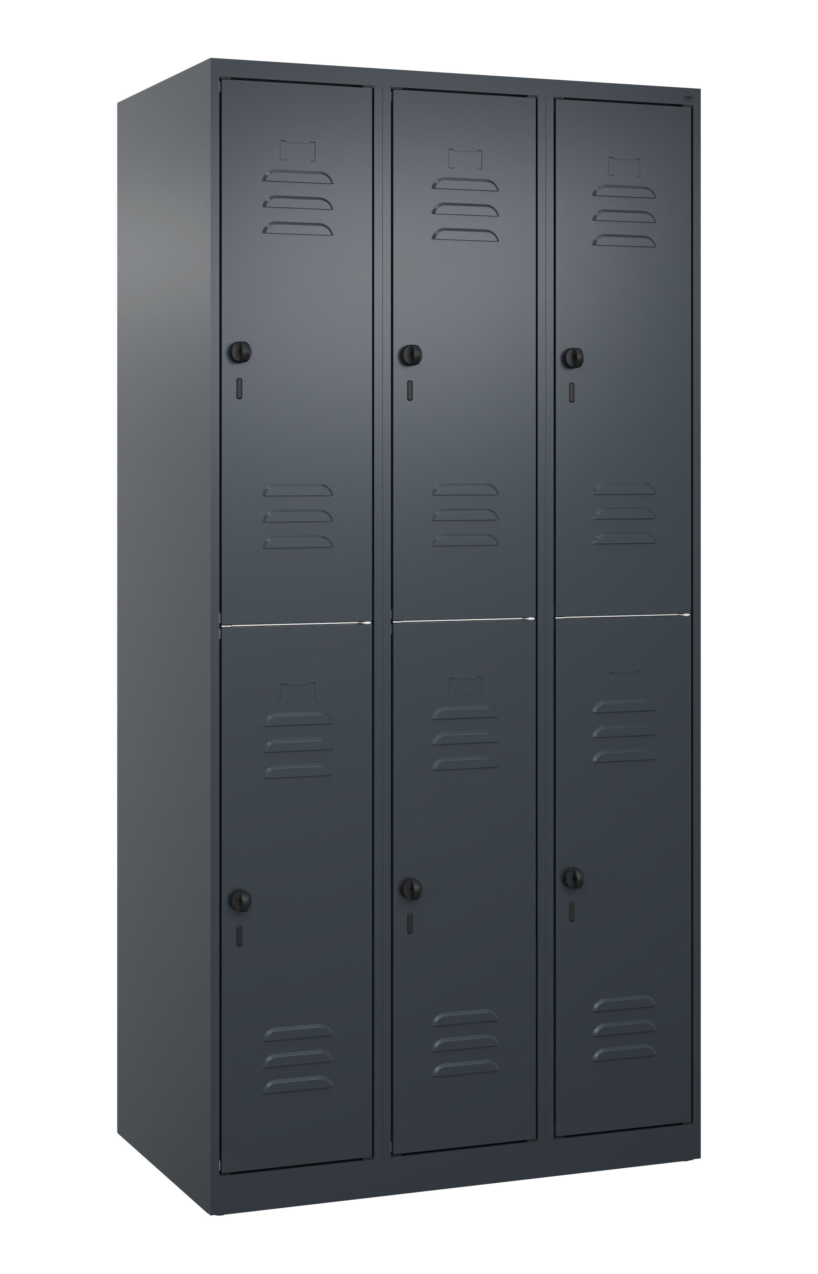 Doppelstöckiger Spind Classic PLUS, 3 Abteile mit je 2 Fächern, Abteilbreite 300 mm, Korpus aus stabiler Stahlkonstruktion mit hochwertiger Einbrennbeschichtung für hohe UV- und Korrosionsbeständigkeit, mit hinteren Belüftungsöffnungen oben und unten, innen je Fach 1 stabile Garderobenstange aus Ovalprofil mit 3 verdrehsicheren Doppel-Schiebehaken inkl. Systemaufnahme, mit Bodengleitern als praktischer Schrank- und Fußbodenschutz, Türöffnungen 110 Grad, Türaufhängung rechts, Stahl-Türen mit Soft-Anschlag und geschlossenen Seitenprofilen für hohe Stabilität, mit Lüftungskiemen oben und unten sowie eingestanztem Etikettenrahmen, Türaufhängung in stabilen Drehbolzen, 6 Ergonomische Sicherheits-Drehriegel für Vorhangschlösser mit Bügelstärke 6 bis 8 mm, inkl. Tür-Schutz, Maße (H x B x T): 1850 x 900 x 500 mm, Korpus: RAL 7016 Anthrazitgrau, Türen Stahl: RAL 7016 Anthrazitgrau, Gewicht: 50 kg