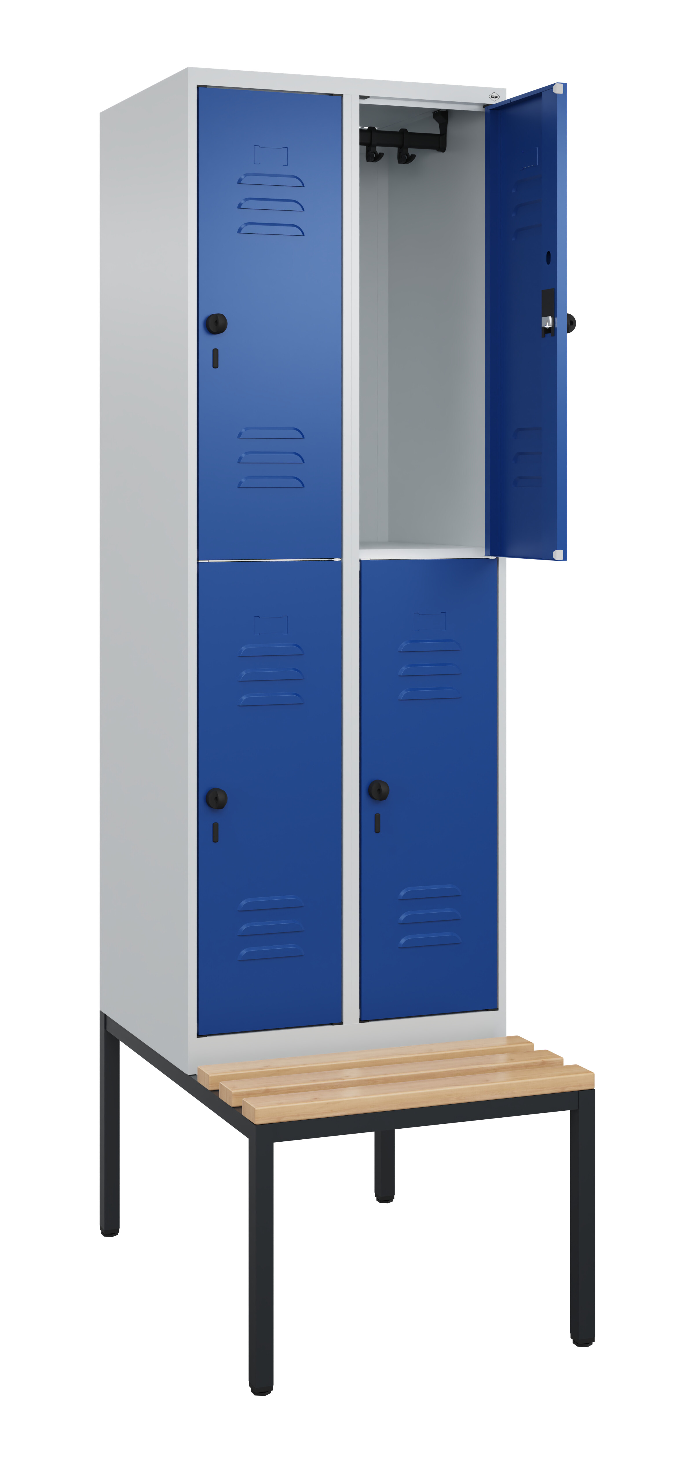 Doppelstöckiger Spind Classic PLUS, 2 Abteile mit je 2 Fächern, Abteilbreite 300 mm, Korpus aus stabiler Stahlkonstruktion mit hochwertiger Einbrennbeschichtung für hohe UV- und Korrosionsbeständigkeit, mit hinteren Belüftungsöffnungen oben und unten, innen je Fach 1 stabile Garderobenstange aus Ovalprofil mit 3 verdrehsicheren Doppel-Schiebehaken inkl. Systemaufnahme, mit untergebauter Sitzbank, Gestell aus stabilem Vierkant-Stahlrohr 30 x 30 mm, mit verstellbaren Bodengleitern für einfachen Niveauausgleich, Türöffnungen 110 Grad, Türaufhängung rechts, Stahl-Türen mit Soft-Anschlag und geschlossenen Seitenprofilen für hohe Stabilität, mit Lüftungskiemen oben und unten sowie eingestanztem Etikettenrahmen, Türaufhängung in stabilen Drehbolzen, 4 Ergonomische Sicherheits-Drehriegel für Vorhangschlösser mit Bügelstärke 6 bis 8 mm, inkl. Tür-Schutz, Sitzleisten aus Buche-Hartholz, im Profil ca. 60 x 30 mm, für guten Sitzkomfort, allseitig gehobelt, klarlackiert mit naturgegebenen Farbunterschieden, Maße (H x B x T): 2120 x 600 x 815 mm, Korpus: RAL 7035 Lichtgrau, Türen Stahl: RAL 5010 Enzianblau, Gestell: RAL 7021 Schwarzgrau, Gewicht: 41 kg