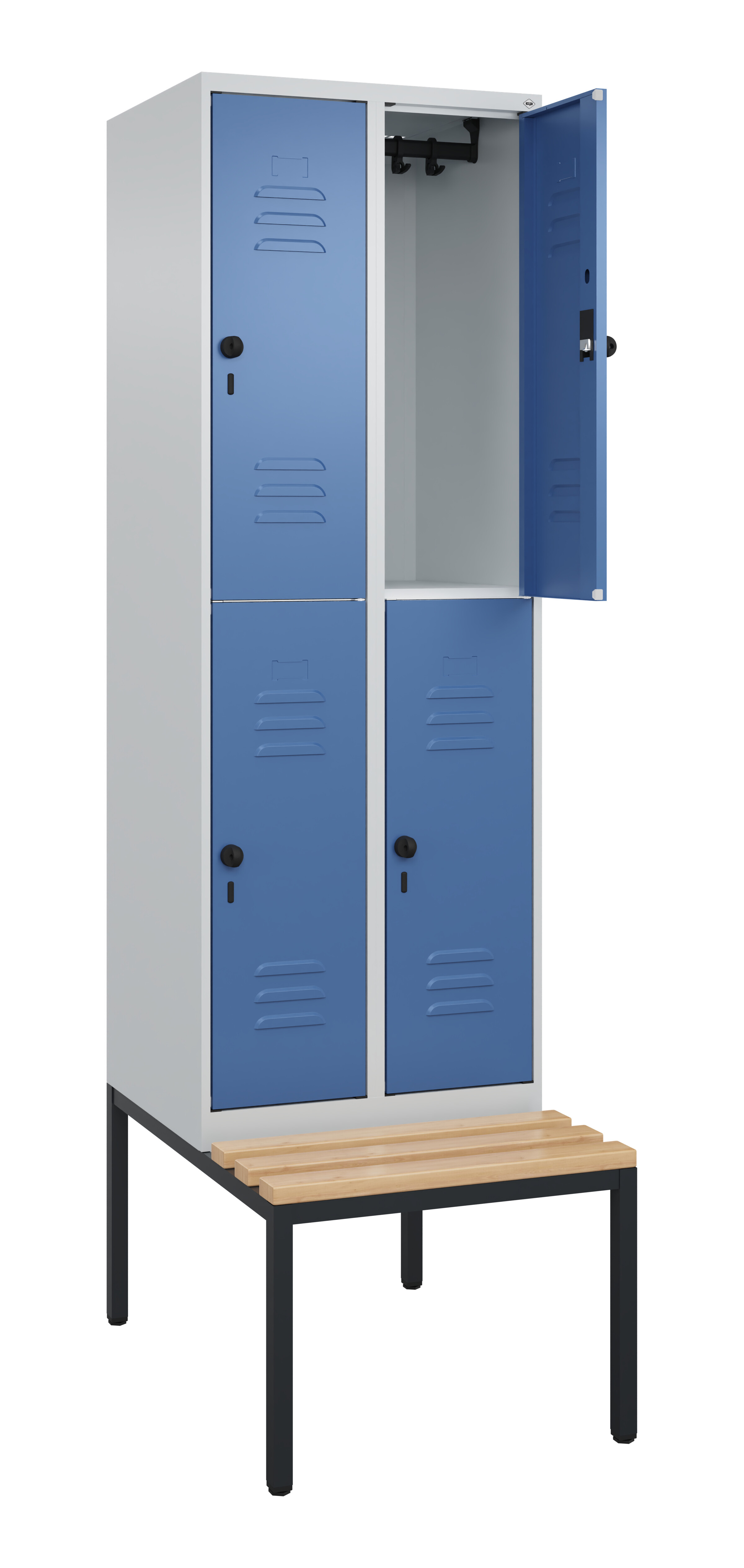 Doppelstöckiger Spind Classic PLUS, 2 Abteile mit je 2 Fächern, Abteilbreite 300 mm, Korpus aus stabiler Stahlkonstruktion mit hochwertiger Einbrennbeschichtung für hohe UV- und Korrosionsbeständigkeit, mit hinteren Belüftungsöffnungen oben und unten, innen je Fach 1 stabile Garderobenstange aus Ovalprofil mit 3 verdrehsicheren Doppel-Schiebehaken inkl. Systemaufnahme, mit untergebauter Sitzbank, Gestell aus stabilem Vierkant-Stahlrohr 30 x 30 mm, mit verstellbaren Bodengleitern für einfachen Niveauausgleich, Türöffnungen 110 Grad, Türaufhängung rechts, Stahl-Türen mit Soft-Anschlag und geschlossenen Seitenprofilen für hohe Stabilität, mit Lüftungskiemen oben und unten sowie eingestanztem Etikettenrahmen, Türaufhängung in stabilen Drehbolzen, 4 Ergonomische Sicherheits-Drehriegel für Vorhangschlösser mit Bügelstärke 6 bis 8 mm, inkl. Tür-Schutz, Sitzleisten aus Buche-Hartholz, im Profil ca. 60 x 30 mm, für guten Sitzkomfort, allseitig gehobelt, klarlackiert mit naturgegebenen Farbunterschieden, Maße (H x B x T): 2120 x 600 x 815 mm, Korpus: RAL 7035 Lichtgrau, Türen Stahl: RAL 5023 Fernblau, Gestell: RAL 7021 Schwarzgrau, Gewicht: 41 kg