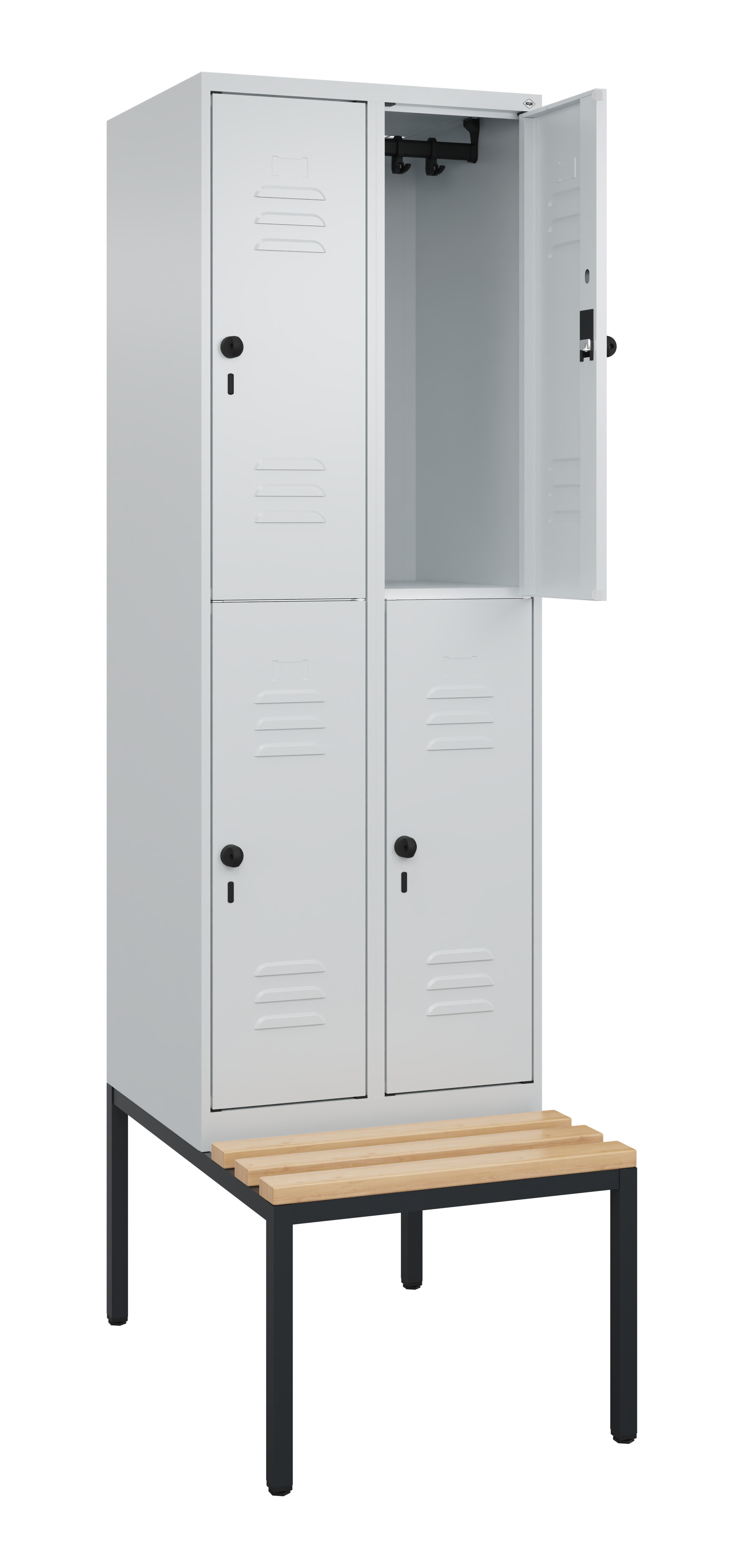 Doppelstöckiger Spind Classic PLUS, 2 Abteile mit je 2 Fächern, Abteilbreite 300 mm, Korpus aus stabiler Stahlkonstruktion mit hochwertiger Einbrennbeschichtung für hohe UV- und Korrosionsbeständigkeit, mit hinteren Belüftungsöffnungen oben und unten, innen je Fach 1 stabile Garderobenstange aus Ovalprofil mit 3 verdrehsicheren Doppel-Schiebehaken inkl. Systemaufnahme, mit untergebauter Sitzbank, Gestell aus stabilem Vierkant-Stahlrohr 30 x 30 mm, mit verstellbaren Bodengleitern für einfachen Niveauausgleich, Türöffnungen 110 Grad, Türaufhängung rechts, Stahl-Türen mit Soft-Anschlag und geschlossenen Seitenprofilen für hohe Stabilität, mit Lüftungskiemen oben und unten sowie eingestanztem Etikettenrahmen, Türaufhängung in stabilen Drehbolzen, 4 Ergonomische Sicherheits-Drehriegel für Vorhangschlösser mit Bügelstärke 6 bis 8 mm, inkl. Tür-Schutz, Sitzleisten aus Buche-Hartholz, im Profil ca. 60 x 30 mm, für guten Sitzkomfort, allseitig gehobelt, klarlackiert mit naturgegebenen Farbunterschieden, Maße (H x B x T): 2120 x 600 x 815 mm, Korpus: RAL 7035 Lichtgrau, Türen Stahl: RAL 7035 Lichtgrau, Gestell: RAL 7021 Schwarzgrau, Gewicht: 41 kg