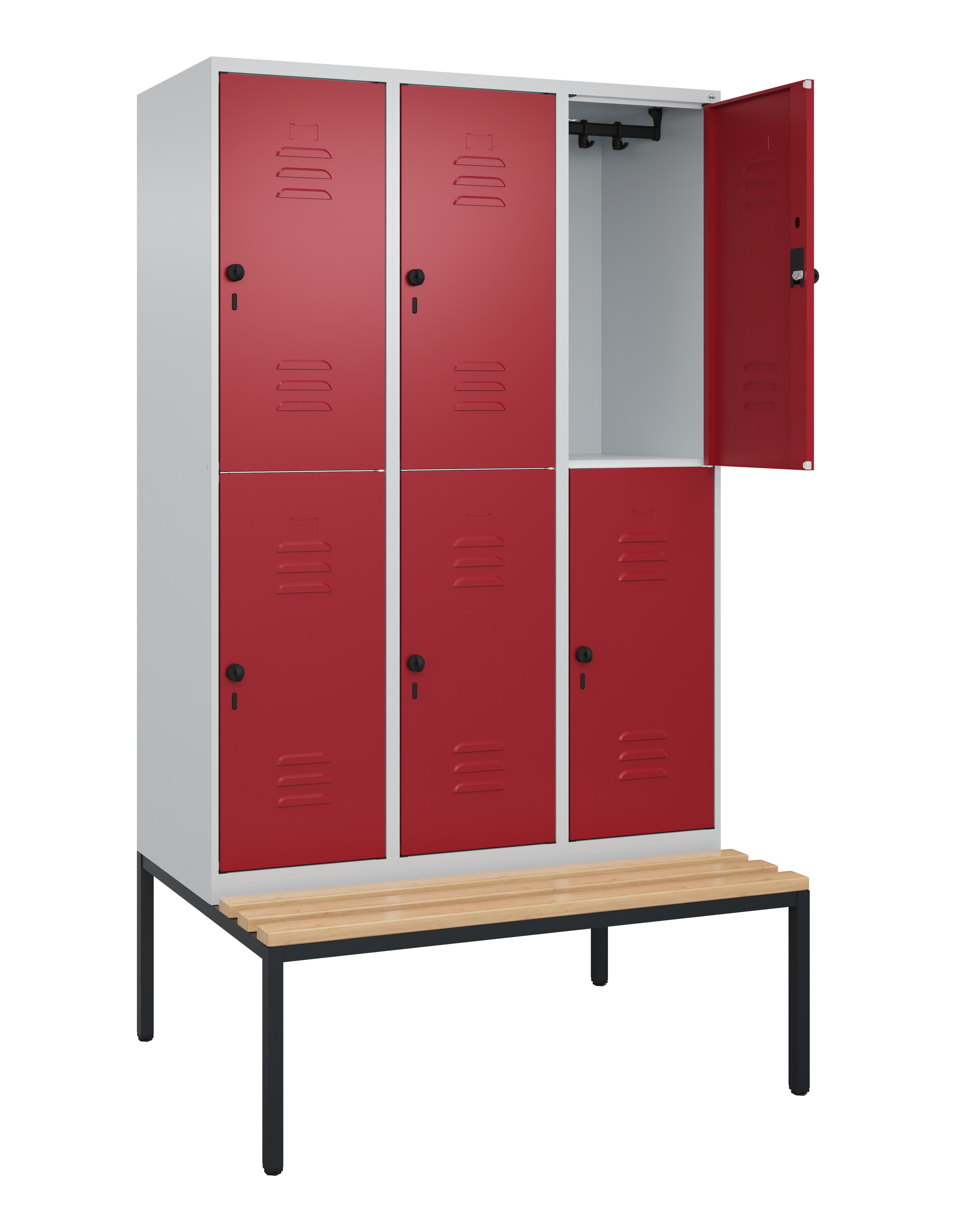 Doppelstöckiger Spind Classic PLUS, 3 Abteile mit je 2 Fächern, Abteilbreite 400 mm, Korpus aus stabiler Stahlkonstruktion mit hochwertiger Einbrennbeschichtung für hohe UV- und Korrosionsbeständigkeit, mit hinteren Belüftungsöffnungen oben und unten, innen je Fach 1 stabile Garderobenstange aus Ovalprofil mit 4 verdrehsicheren Doppel-Schiebehaken inkl. Systemaufnahme, mit untergebauter Sitzbank, Gestell aus stabilem Vierkant-Stahlrohr 30 x 30 mm, mit verstellbaren Bodengleitern für einfachen Niveauausgleich, Türöffnungen 110 Grad, Türaufhängung rechts, Stahl-Türen mit Soft-Anschlag und geschlossenen Seitenprofilen für hohe Stabilität, mit Lüftungskiemen oben und unten sowie eingestanztem Etikettenrahmen, Türaufhängung in stabilen Drehbolzen, 6 Ergonomische Sicherheits-Drehriegel für Vorhangschlösser mit Bügelstärke 6 bis 8 mm, inkl. Tür-Schutz, Sitzleisten aus Buche-Hartholz, im Profil ca. 60 x 30 mm, für guten Sitzkomfort, allseitig gehobelt, klarlackiert mit naturgegebenen Farbunterschieden, Maße (H x B x T): 2120 x 1200 x 815 mm, Korpus: RAL 7035 Lichtgrau, Türen Stahl: RAL 3003 Rubinrot, Gestell: RAL 7021 Schwarzgrau, Gewicht: 70 kg