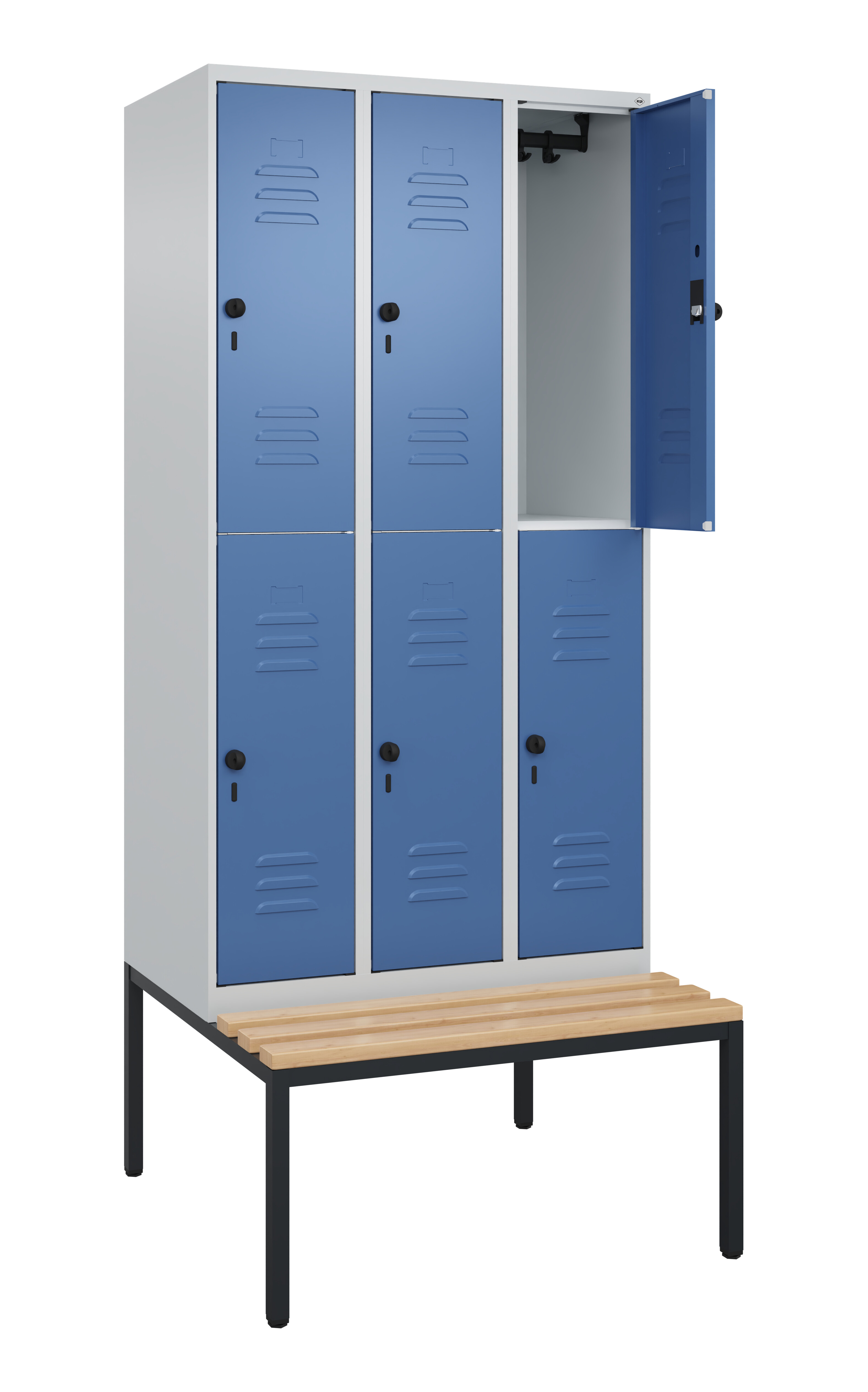 Doppelstöckiger Spind Classic PLUS, 3 Abteile mit je 2 Fächern, Abteilbreite 300 mm, Korpus aus stabiler Stahlkonstruktion mit hochwertiger Einbrennbeschichtung für hohe UV- und Korrosionsbeständigkeit, mit hinteren Belüftungsöffnungen oben und unten, innen je Fach 1 stabile Garderobenstange aus Ovalprofil mit 3 verdrehsicheren Doppel-Schiebehaken inkl. Systemaufnahme, mit untergebauter Sitzbank, Gestell aus stabilem Vierkant-Stahlrohr 30 x 30 mm, mit verstellbaren Bodengleitern für einfachen Niveauausgleich, Türöffnungen 110 Grad, Stahl-Türen mit Soft-Anschlag und geschlossenen Seitenprofilen für hohe Stabilität, mit Lüftungskiemen oben und unten sowie eingestanztem Etikettenrahmen, Türaufhängung in stabilen Drehbolzen, Türaufhängung rechts, 6 Ergonomische Sicherheits-Drehriegel für Vorhangschlösser mit Bügelstärke 6 bis 8 mm, inkl. Tür-Schutz, Sitzleisten aus Buche-Hartholz, im Profil ca. 60 x 30 mm, für guten Sitzkomfort, allseitig gehobelt, klarlackiert mit naturgegebenen Farbunterschieden, Maße (H x B x T): 2120 x 900 x 815 mm, Korpus: RAL 7035 Lichtgrau, Türen Stahl: RAL 5023 Fernblau, Gestell: RAL 7021 Schwarzgrau, Gewicht: 58 kg