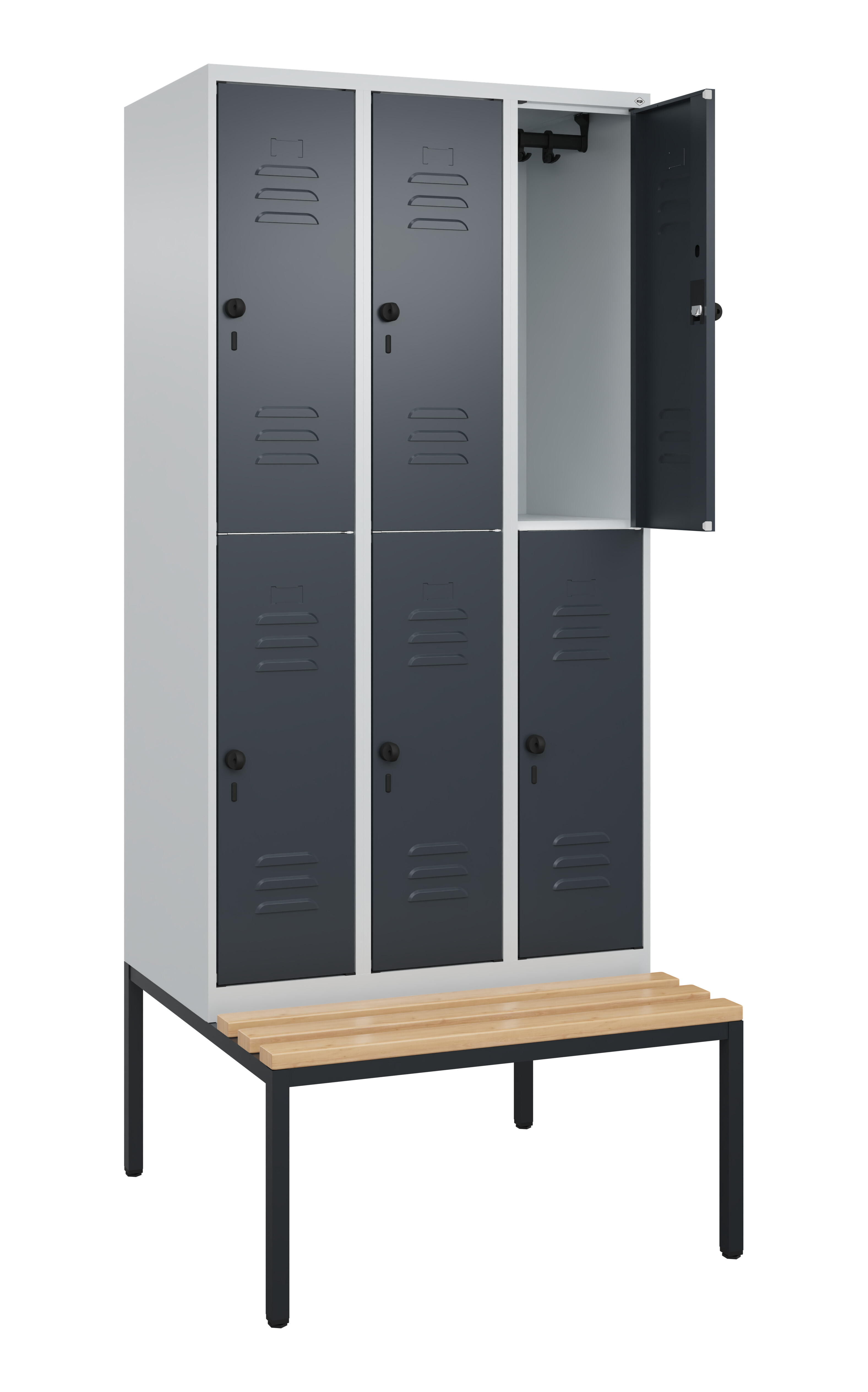 Doppelstöckiger Spind Classic PLUS, 3 Abteile mit je 2 Fächern, Abteilbreite 300 mm, Korpus aus stabiler Stahlkonstruktion mit hochwertiger Einbrennbeschichtung für hohe UV- und Korrosionsbeständigkeit, mit hinteren Belüftungsöffnungen oben und unten, innen je Fach 1 stabile Garderobenstange aus Ovalprofil mit 3 verdrehsicheren Doppel-Schiebehaken inkl. Systemaufnahme, mit untergebauter Sitzbank, Gestell aus stabilem Vierkant-Stahlrohr 30 x 30 mm, mit verstellbaren Bodengleitern für einfachen Niveauausgleich, Türöffnungen 110 Grad, Türaufhängung rechts, Stahl-Türen mit Soft-Anschlag und geschlossenen Seitenprofilen für hohe Stabilität, mit Lüftungskiemen oben und unten sowie eingestanztem Etikettenrahmen, Türaufhängung in stabilen Drehbolzen, 6 Ergonomische Sicherheits-Drehriegel für Vorhangschlösser mit Bügelstärke 6 bis 8 mm, inkl. Tür-Schutz, Sitzleisten aus Buche-Hartholz, im Profil ca. 60 x 30 mm, für guten Sitzkomfort, allseitig gehobelt, klarlackiert mit naturgegebenen Farbunterschieden, Maße (H x B x T): 2120 x 900 x 815 mm, Korpus: RAL 7035 Lichtgrau, Türen Stahl: RAL 7016 Anthrazitgrau, Gestell: RAL 7021 Schwarzgrau, Gewicht: 58 kg