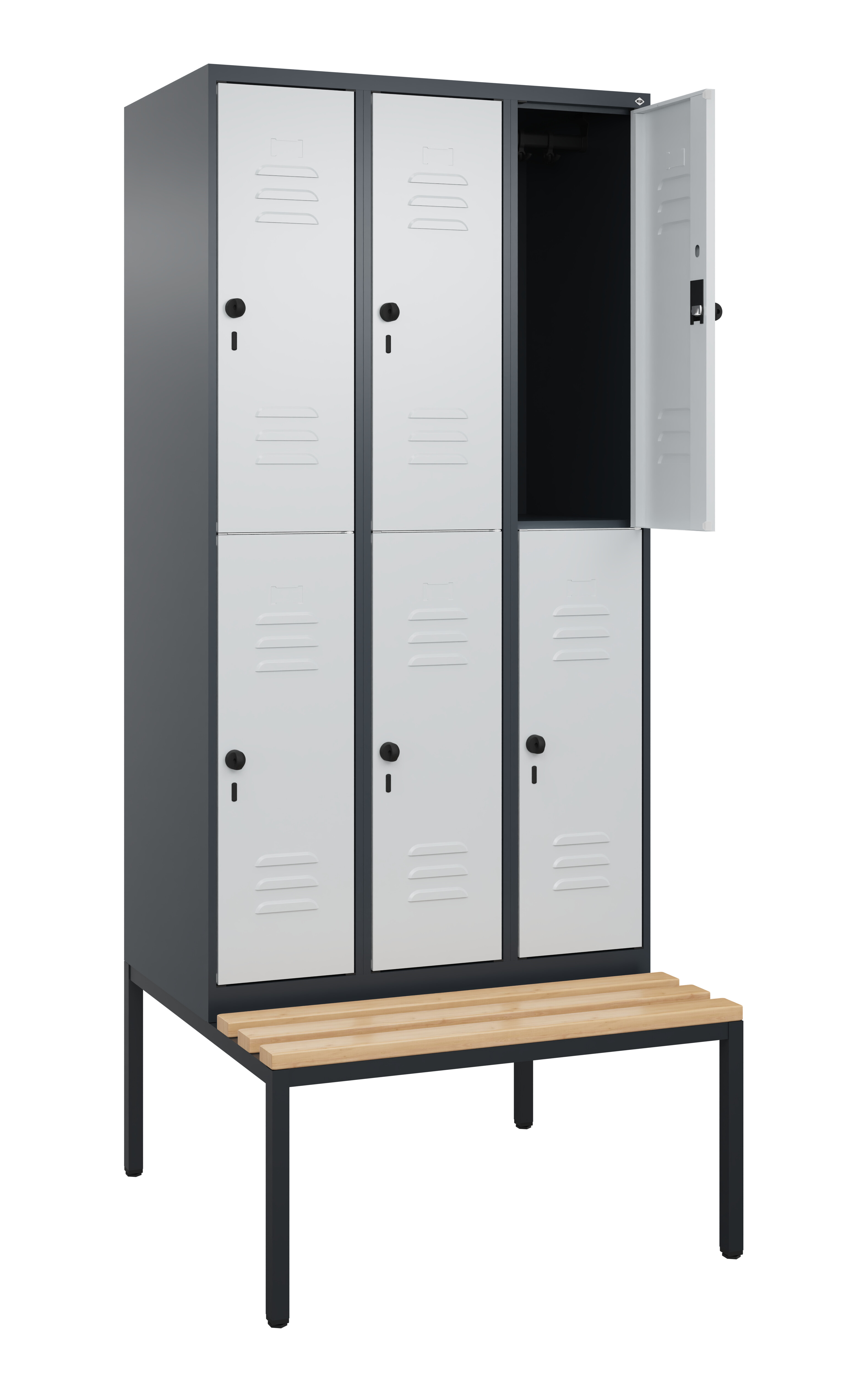 Doppelstöckiger Spind Classic PLUS, 3 Abteile mit je 2 Fächern, Abteilbreite 300 mm, Korpus aus stabiler Stahlkonstruktion mit hochwertiger Einbrennbeschichtung für hohe UV- und Korrosionsbeständigkeit, mit hinteren Belüftungsöffnungen oben und unten, innen je Fach 1 stabile Garderobenstange aus Ovalprofil mit 3 verdrehsicheren Doppel-Schiebehaken inkl. Systemaufnahme, mit untergebauter Sitzbank, Gestell aus stabilem Vierkant-Stahlrohr 30 x 30 mm, mit verstellbaren Bodengleitern für einfachen Niveauausgleich, Türöffnungen 110 Grad, Türaufhängung rechts, Stahl-Türen mit Soft-Anschlag und geschlossenen Seitenprofilen für hohe Stabilität, mit Lüftungskiemen oben und unten sowie eingestanztem Etikettenrahmen, Türaufhängung in stabilen Drehbolzen, 6 Ergonomische Sicherheits-Drehriegel für Vorhangschlösser mit Bügelstärke 6 bis 8 mm, inkl. Tür-Schutz, Sitzleisten aus Buche-Hartholz, im Profil ca. 60 x 30 mm, für guten Sitzkomfort, allseitig gehobelt, klarlackiert mit naturgegebenen Farbunterschieden, Maße (H x B x T): 2120 x 900 x 815 mm, Korpus: RAL 7016 Anthrazitgrau, Türen Stahl: RAL 7035 Lichtgrau, Gestell: RAL 7021 Schwarzgrau, Gewicht: 58 kg