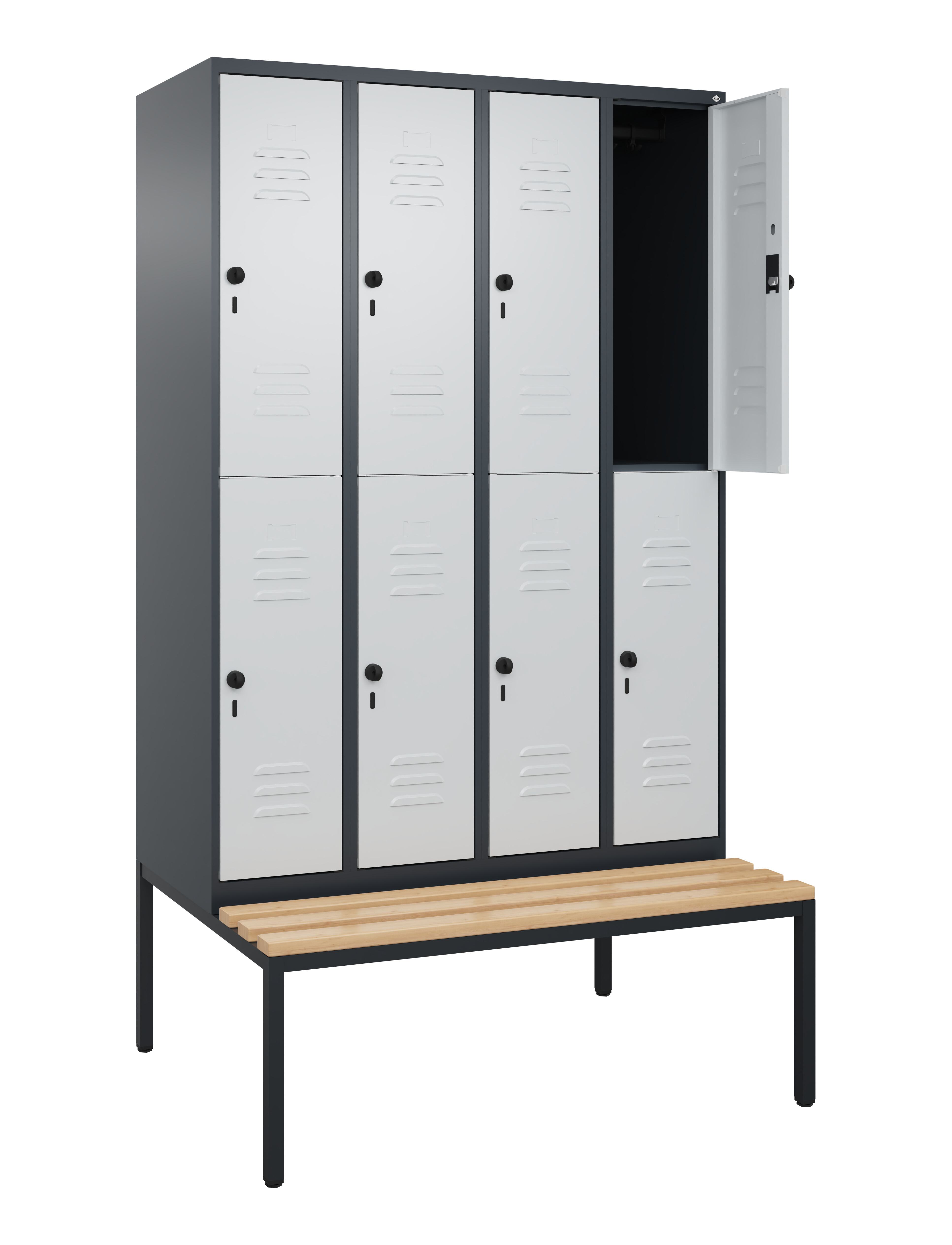 Doppelstöckiger Spind Classic PLUS, 4 Abteile mit je 2 Fächern, Abteilbreite 300 mm, Korpus aus stabiler Stahlkonstruktion mit hochwertiger Einbrennbeschichtung für hohe UV- und Korrosionsbeständigkeit, mit hinteren Belüftungsöffnungen oben und unten, innen je Fach 1 stabile Garderobenstange aus Ovalprofil mit 3 verdrehsicheren Doppel-Schiebehaken inkl. Systemaufnahme, mit untergebauter Sitzbank, Gestell aus stabilem Vierkant-Stahlrohr 30 x 30 mm, mit verstellbaren Bodengleitern für einfachen Niveauausgleich, Türöffnungen 110 Grad, Türaufhängung rechts, Stahl-Türen mit Soft-Anschlag und geschlossenen Seitenprofilen für hohe Stabilität, mit Lüftungskiemen oben und unten sowie eingestanztem Etikettenrahmen, Türaufhängung in stabilen Drehbolzen, 8 Ergonomische Sicherheits-Drehriegel für Vorhangschlösser mit Bügelstärke 6 bis 8 mm, inkl. Tür-Schutz, Sitzleisten aus Buche-Hartholz, im Profil ca. 60 x 30 mm, für guten Sitzkomfort, allseitig gehobelt, klarlackiert mit naturgegebenen Farbunterschieden, Maße (H x B x T): 2120 x 1200 x 815 mm, Korpus: RAL 7016 Anthrazitgrau, Türen Stahl: RAL 7035 Lichtgrau, Gestell: RAL 7021 Schwarzgrau, Gewicht: 72 kg