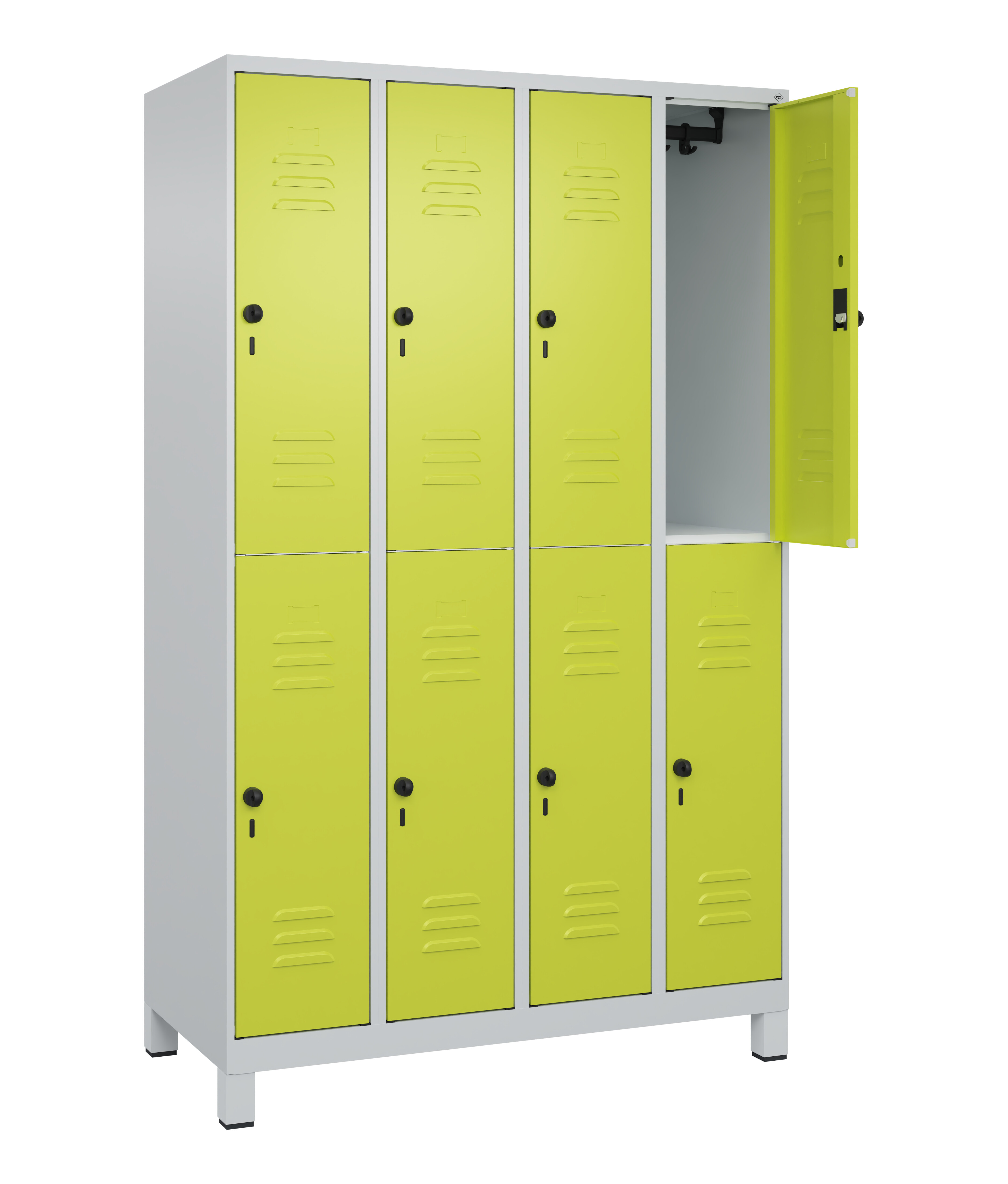 Doppelstöckiger Spind Classic PLUS, 4 Abteile mit je 2 Fächern, Abteilbreite 300 mm, Korpus aus stabiler Stahlkonstruktion mit hochwertiger Einbrennbeschichtung für hohe UV- und Korrosionsbeständigkeit, mit hinteren Belüftungsöffnungen oben und unten, innen je Fach 1 stabile Garderobenstange aus Ovalprofil mit 3 verdrehsicheren Doppel-Schiebehaken inkl. Systemaufnahme, Türöffnungen 110 Grad, Türaufhängung rechts, Stahl-Türen mit Soft-Anschlag und geschlossenen Seitenprofilen für hohe Stabilität, mit Lüftungskiemen oben und unten sowie eingestanztem Etikettenrahmen, Türaufhängung in stabilen Drehbolzen, 8 Ergonomische Sicherheits-Drehriegel für Vorhangschlösser mit Bügelstärke 6 bis 8 mm, inkl. Tür-Schutz, 100 mm hohe Füße aus Kunststoff für erweiterten Korrosionsschutz, Maße (H x B x T): 1950 x 1200 x 500 mm, Korpus: RAL 7035 Lichtgrau, Türen Stahl: 1108060 RDS Clowngrün, Füße: RAL 7035 Lichtgrau, Gewicht: 64 kg