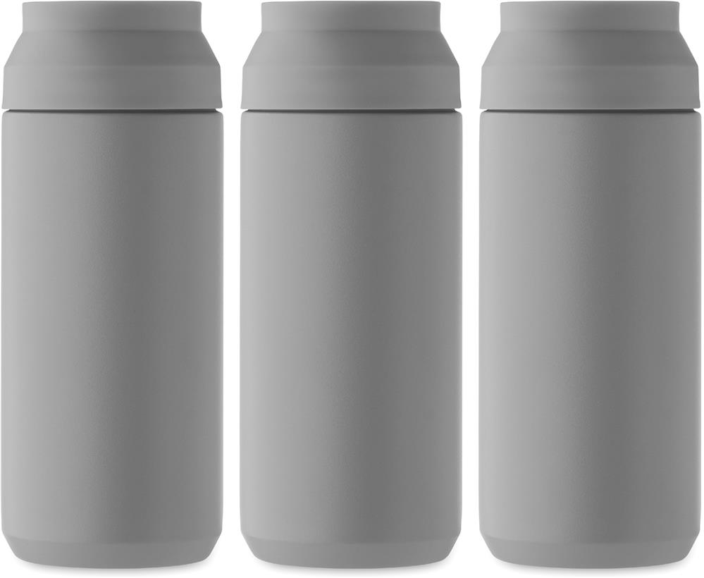 Doppelwandige Isolierflasche aus recyceltem Edelstahl (90 % recycelter Edelstahl und 10 % Edelstahl) mit doppelter Deckelöffnung aus PP zur einfachen Reinigung. Auslaufsicher. Füllmenge: 320 ml.