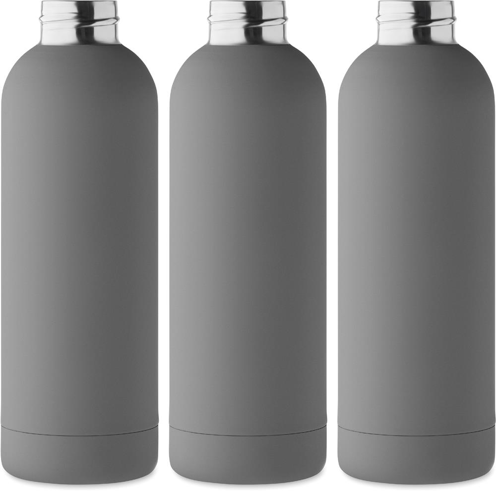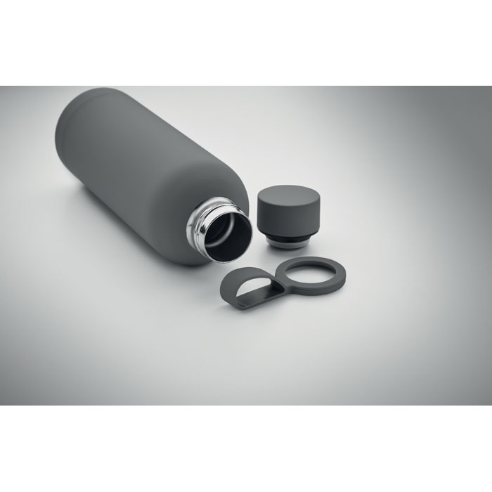 Doppelwandige Vakuum-Isolierflasche aus recyceltem Edelstahl (90% recycelter Edelstahl und 10% Edelstahl) mit gummiertem Finish und Schlaufe aus Silikon. Auslaufsicher. Füllmenge: 500 ml.