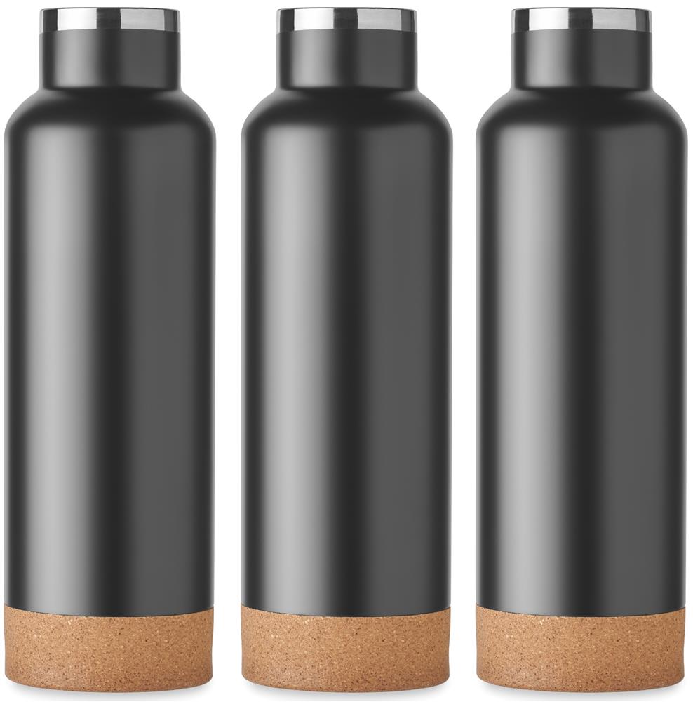 Doppelwandige Flasche aus recyceltem Edelstahl. Deckel mit Henkel und Korkboden. Auslaufsicher. Füllmenge: 500 ml. (90 % recycelter Edelstahl und 10 % Edelstahl).