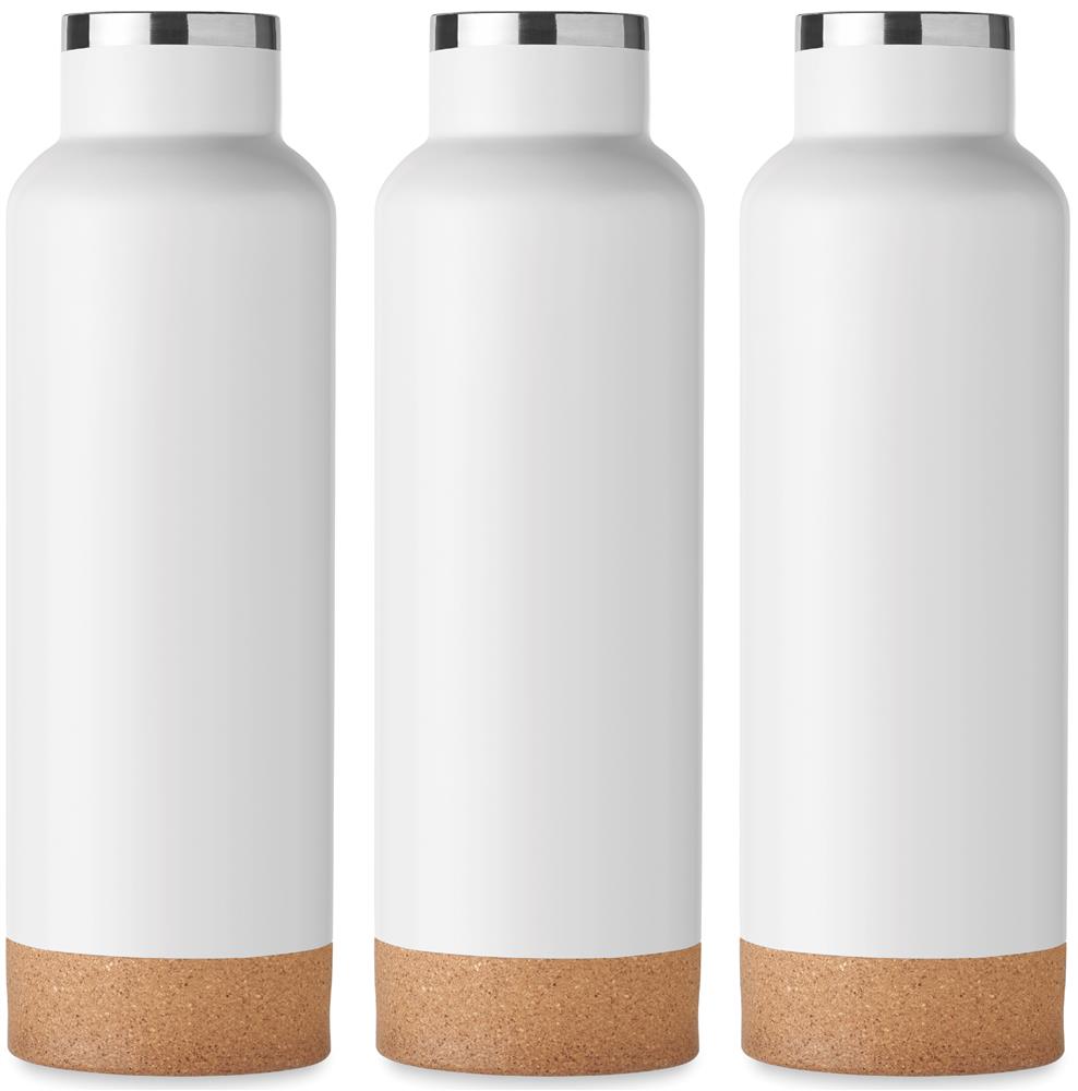 Doppelwandige Flasche aus recyceltem Edelstahl. Deckel mit Henkel und Korkboden. Auslaufsicher. Füllmenge: 500 ml. (90 % recycelter Edelstahl und 10 % Edelstahl).