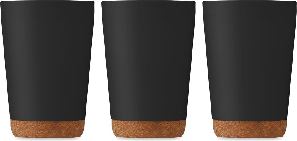 Doppelwandiger Becher aus PP mit Korkboden. Trinköffnung im Deckel aus PS und ABS. Füllmenge: 300 ml.