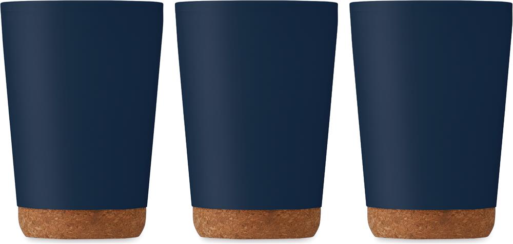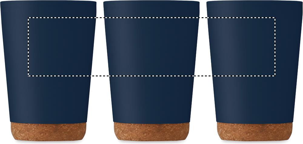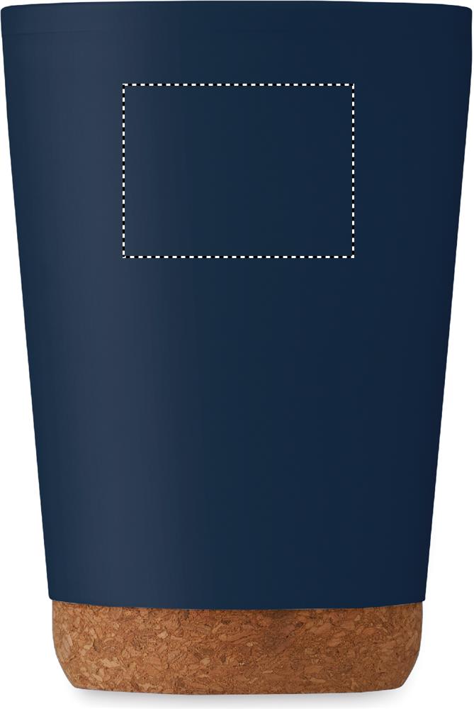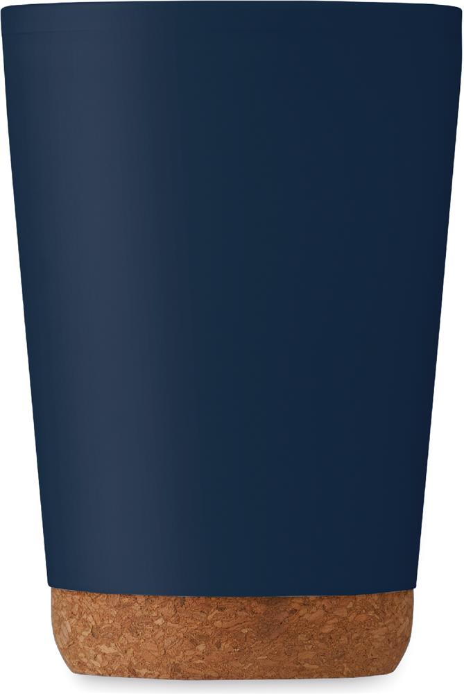 Doppelwandiger Becher aus PP mit Korkboden. Trinköffnung im Deckel aus PS und ABS. Füllmenge: 300 ml.