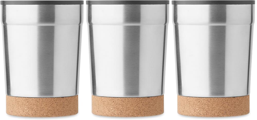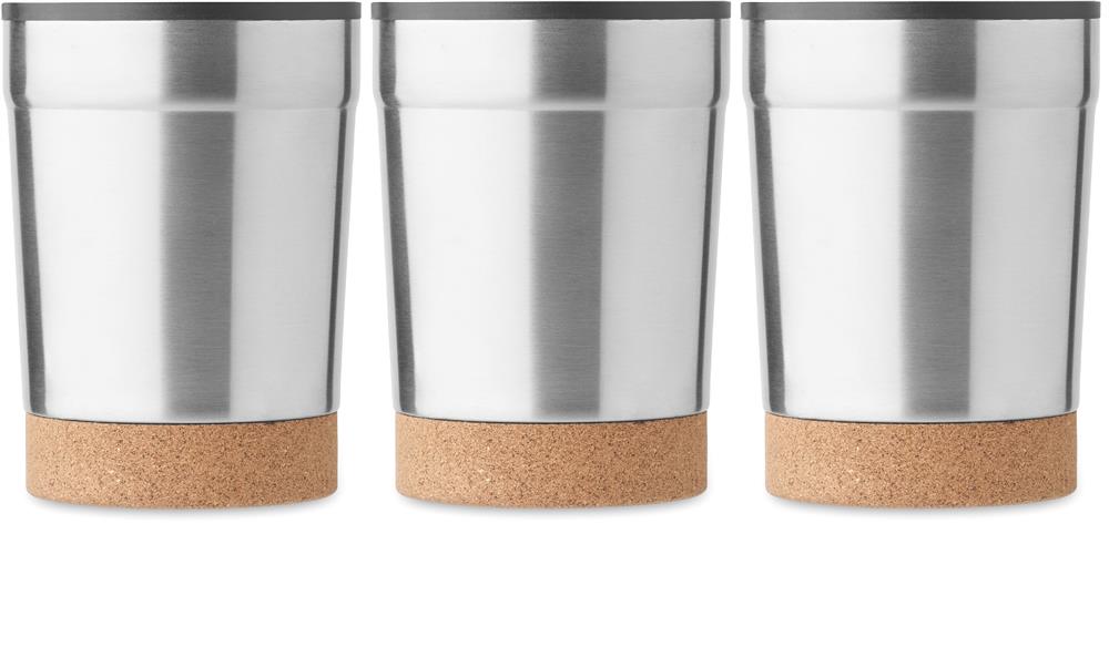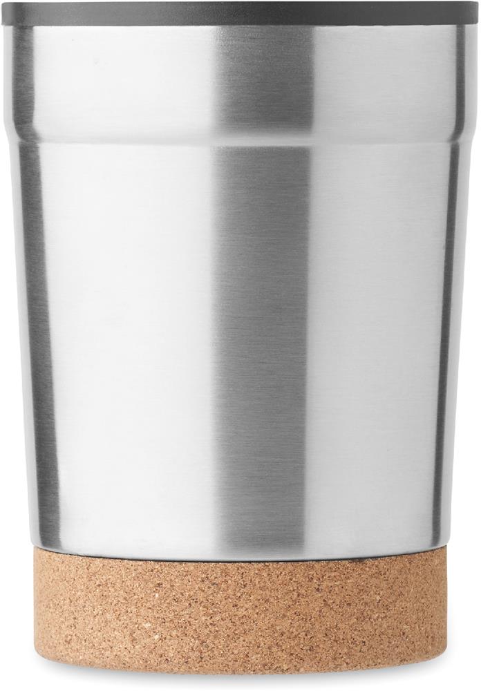 Doppelwandiger Becher aus Edelstahl mit PP-Innenseite. Der Boden ist mit Kork abgesetzt. Schiebedeckel mit Trinköffnung. Auslaufsicher. Füllmenge: 300 ml.