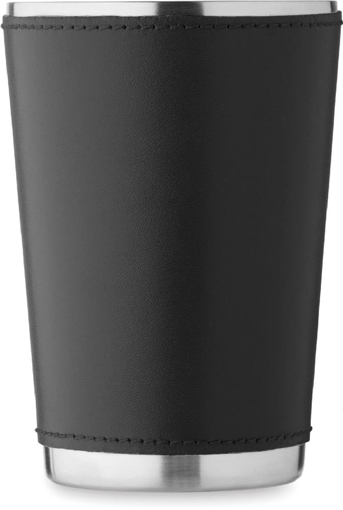 Doppelwandiger Trinkbecher aus recyceltem Edelstahl (90% recycelter Edelstahl und 10% Edelstahl) mit abnehmbarer Hülle aus PU. Schiebedeckel mit Trinköffnung. Auslaufsicher. Füllmenge: 350 ml.