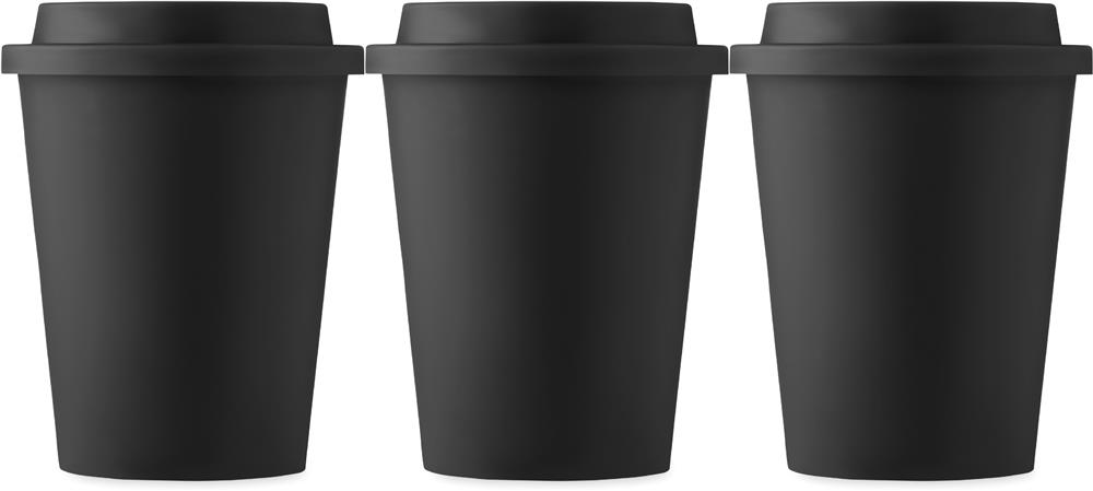 Doppelwandiger Trinkbecher. Deckel mit Mundstück aus PP. Füllmenge: 300 ml.