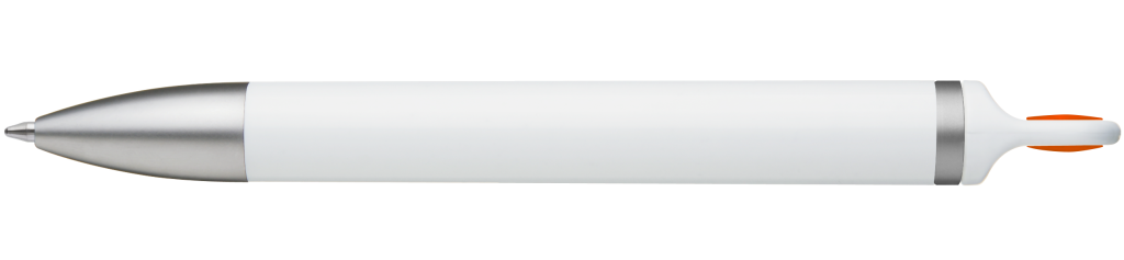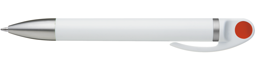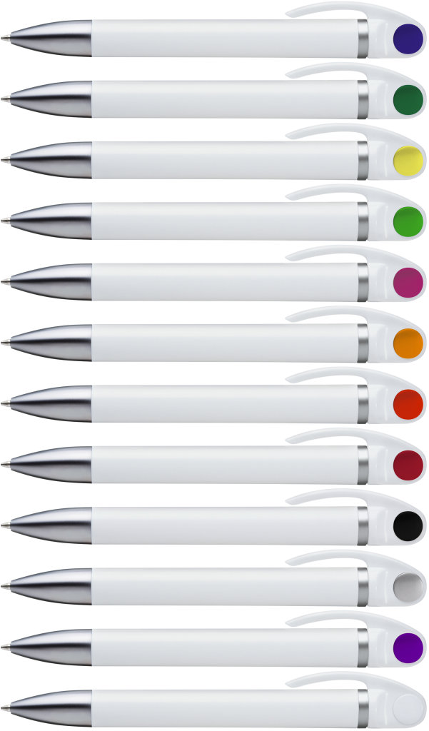 Weißer Kunststoff-Kugelschreiber mit farbigem Clip, blauschreibend.Maße: ø10×138 mmSchreibgerät-Typ: KugelschreiberSchreibgerät-Mechanik: DruckmechanikSchreibfarbe: BlauMinentyp: Normale MineLinienstärke: 1 mmMaterial: Kunststoff (ABS)Veredelungsposition 1: Korpus - rechts vom ClipTechnologie: UV-LED-Druck - EinzelnamenDurchmesser: 0Druckcode: NUVATechnologie: TampondruckMaximale Farben: 4Durchmesser: 0Druckcode: P0Technologie: TampondruckMaximale Farben: 1Durchmesser: 0Druckcode: P1Technologie: UV LED DruckDurchmesser: 0Druckcode: UVAVeredelungsposition 2: Korpus - links vom ClipTechnologie: UV-LED-Druck - EinzelnamenDurchmesser: 0Druckcode: NUVATechnologie: TampondruckMaximale Farben: 4Durchmesser: 0Druckcode: P0Technologie: TampondruckMaximale Farben: 1Durchmesser: 0Druckcode: P1Technologie: UV LED DruckDurchmesser: 0Druckcode: UVAVeredelungsposition 3: KlipTechnologie: TampondruckMaximale Farben: 4Durchmesser: 0Druckcode: P0Veredelungsposition 4: Korpus - in Verlängerung vom ClipTechnologie: TampondruckMaximale Farben: 4Durchmesser: 0Druckcode: P0