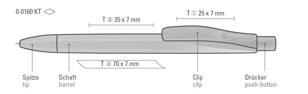 Druckbereich: Auf dem Clip 25mm x 7mm Tampondruck (T), in Clipverlängerung 35mm x 7mm Tampondruck (T), gegenüber vom Clip 70mm x 7mm Tampondruck (T)