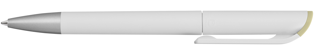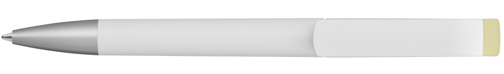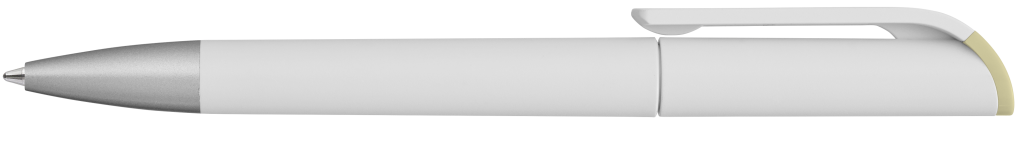 Drehkugelschreiber mit gedeckt mattem Gehäuse in weiß, farbig glänzendem Stopfen und Spitze silber matt.