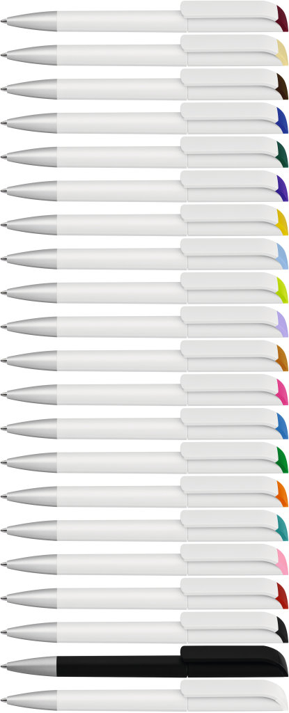 Weißer Kunststoff-Kugelschreiber mit farbigem Clip, blauschreibend.Maße: ø10×138 mmSchreibgerät-Typ: KugelschreiberSchreibgerät-Mechanik: DruckmechanikSchreibfarbe: BlauMinentyp: Normale MineLinienstärke: 1 mmMaterial: Kunststoff (ABS)Veredelungsposition 1: Korpus - rechts vom ClipTechnologie: UV-LED-Druck - EinzelnamenDurchmesser: 0Druckcode: NUVATechnologie: TampondruckMaximale Farben: 4Durchmesser: 0Druckcode: P0Technologie: TampondruckMaximale Farben: 1Durchmesser: 0Druckcode: P1Technologie: UV LED DruckDurchmesser: 0Druckcode: UVAVeredelungsposition 2: Korpus - links vom ClipTechnologie: UV-LED-Druck - EinzelnamenDurchmesser: 0Druckcode: NUVATechnologie: TampondruckMaximale Farben: 4Durchmesser: 0Druckcode: P0Technologie: TampondruckMaximale Farben: 1Durchmesser: 0Druckcode: P1Technologie: UV LED DruckDurchmesser: 0Druckcode: UVAVeredelungsposition 3: KlipTechnologie: TampondruckMaximale Farben: 4Durchmesser: 0Druckcode: P0Veredelungsposition 4: Korpus - in Verlängerung vom ClipTechnologie: TampondruckMaximale Farben: 4Durchmesser: 0Druckcode: P0