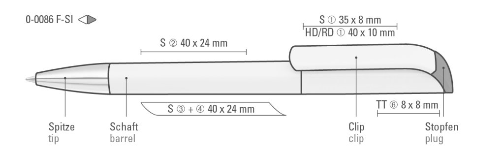 Druckbereich: Auf dem Clip 35mm x 8mm Siebdruck (S), in Clipverlängerung 40mm x 24mm Siebdruck (S), gegenüber vom Clip 40mm x 24mm Siebdruck (S), seitlich vom Clip 40mm x 24mm Siebdruck (S), auf dem Stopfen 8mm x 8mm Tampondruck (T), auf dem Clip 40mm x 10mm Digitaldruck (HD), auf dem Clip 40mm x 10mm Reliefdruck (HD)