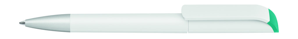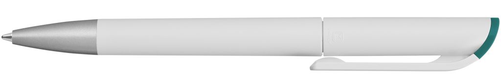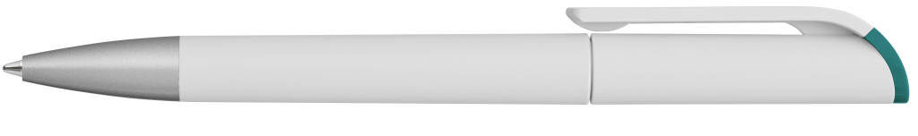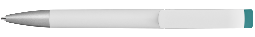 Drehkugelschreiber mit gedeckt mattem Gehäuse in weiß, farbig glänzendem Stopfen und Spitze silber matt.Druckbereich: Auf dem Clip 35mm x 8mm Siebdruck (S), in Clipverlängerung 40mm x 24mm Siebdruck (S), gegenüber vom Clip 40mm x 24mm Siebdruck (S), seitlich vom Clip 40mm x 24mm Siebdruck (S), auf dem Stopfen 8mm x 8mm Tampondruck (T), auf dem Clip 40mm x 10mm Digitaldruck (HD), auf dem Clip 40mm x 10mm Reliefdruck (HD)