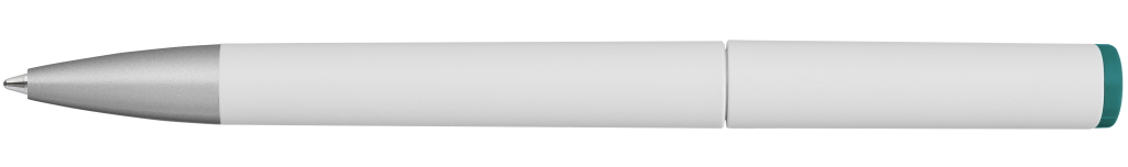 Drehkugelschreiber mit gedeckt mattem Gehäuse in weiß, farbig glänzendem Stopfen und Spitze silber matt.