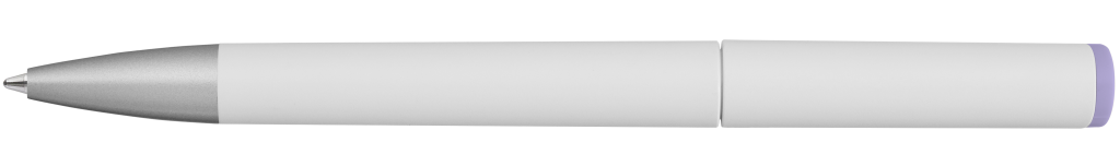 Drehkugelschreiber mit gedeckt mattem Gehäuse in weiß, farbig glänzendem Stopfen und Spitze silber matt.
