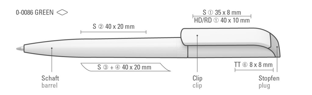Druckbereich: Auf dem Clip 35mm x 8mm Siebdruck (S), in Clipverlängerung 40mm x 20mm Siebdruck (S), gegenüber vom Clip 40mm x 20mm Siebdruck (S), seitlich vom Clip 40mm x 20mm Siebdruck (S), auf dem Stopfen 8mm x 8mm Tampondruck Sonderformat (TT), auf dem Clip 40mm x 10mm Digitaldruck (HD), auf dem Clip 40mm x 10mm Reliefdruck (HD)