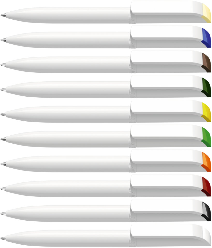 Weißer Kunststoff-Kugelschreiber mit farbigem Clip, blauschreibend.Maße: ø10×138 mmSchreibgerät-Typ: KugelschreiberSchreibgerät-Mechanik: DruckmechanikSchreibfarbe: BlauMinentyp: Normale MineLinienstärke: 1 mmMaterial: Kunststoff (ABS)Veredelungsposition 1: Korpus - rechts vom ClipTechnologie: UV-LED-Druck - EinzelnamenDurchmesser: 0Druckcode: NUVATechnologie: TampondruckMaximale Farben: 4Durchmesser: 0Druckcode: P0Technologie: TampondruckMaximale Farben: 1Durchmesser: 0Druckcode: P1Technologie: UV LED DruckDurchmesser: 0Druckcode: UVAVeredelungsposition 2: Korpus - links vom ClipTechnologie: UV-LED-Druck - EinzelnamenDurchmesser: 0Druckcode: NUVATechnologie: TampondruckMaximale Farben: 4Durchmesser: 0Druckcode: P0Technologie: TampondruckMaximale Farben: 1Durchmesser: 0Druckcode: P1Technologie: UV LED DruckDurchmesser: 0Druckcode: UVAVeredelungsposition 3: KlipTechnologie: TampondruckMaximale Farben: 4Durchmesser: 0Druckcode: P0Veredelungsposition 4: Korpus - in Verlängerung vom ClipTechnologie: TampondruckMaximale Farben: 4Durchmesser: 0Druckcode: P0