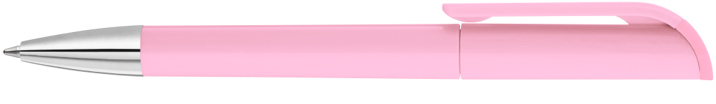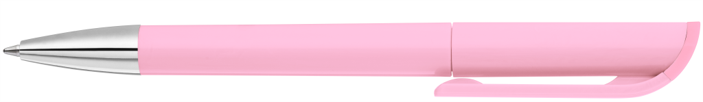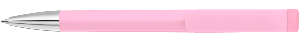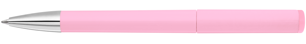 Drehkugelschreiber mit gedeckt glänzendem Gehäuse in weiß, farbig glänzendem Stopfen und Spitze glanzverchromt.