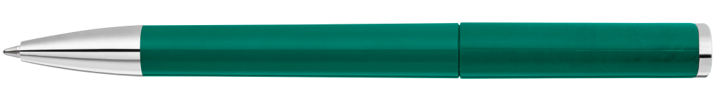 Drehkugelschreiber mit gedeckt glänzendem Gehäuse, Stopfen und Spitze glanzverchromt.